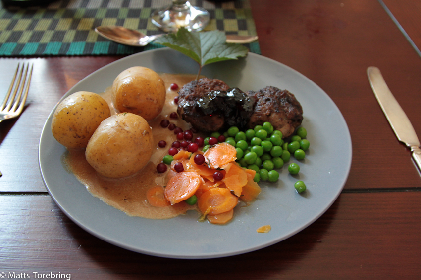 Vi äter en Wallenbergare på älgkött från skogen runtom.