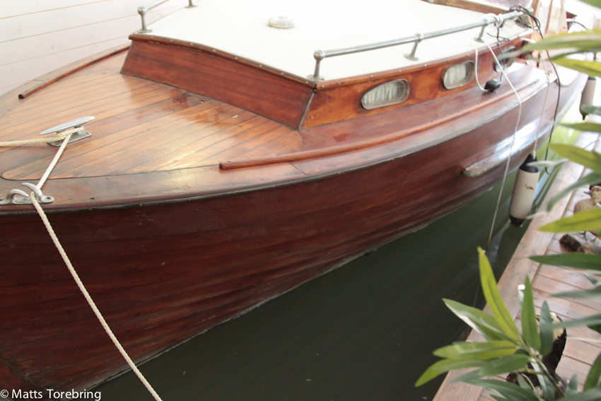 En båt ligger startklar i restaurangen, kanske till Rusken runt.