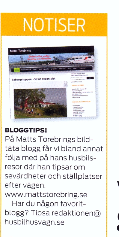 Jag blev ganska överraskad av, att ta del av denna fina tidnings innehåll. Jätteroligt att det vi alla skriver och bloggar om, kommer så många till del och dessutom uppmärksammas på detta sätt. Ett stort Tack till Tidningen Husbil & Husvagn.