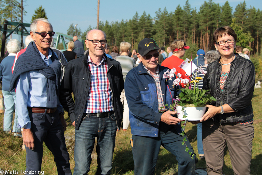Else-Marie Brorsson Welander, till höger i bild, och Lars Welander, tredje man från höger och Egil Brorsson, längst till vänster, överlämnade blommor till restauratören av maskinen. Else-Marie & Egil är generation två i familjen Brorsson.