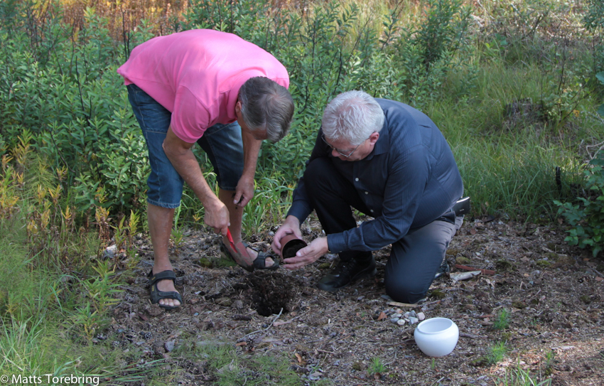 Jag gav rådet till Jan & Mille att avverka några stora tallar, som skymde solen på deras fina sommarhus. Som gammal skogsarbetare vet jag vikten, av att plantera efter avverkning. Därför hade Birgitta och jag med en tallplanta som vi planterade.