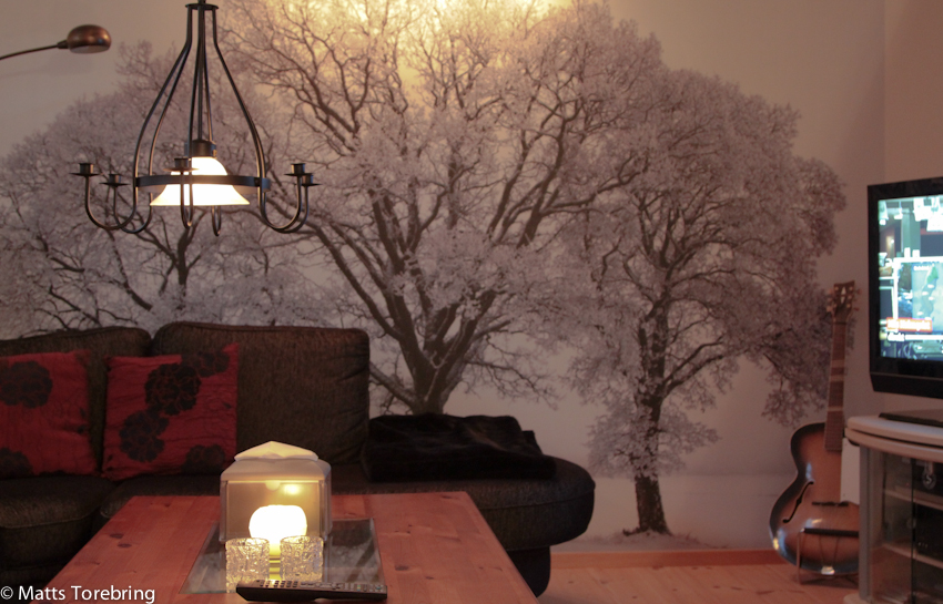 När jag skulle välja ut fondvägg till detta rummet, höll jag på att bli tokig. Jag letade på nätet hos en stor aktör. När jag hade bläddrat mig fram till sidan ”220”, orkade jag inte se mera. På det stora tapetvaruhuset i Jönköping, hittade vi denna, med ett lätt vintermotiv, för att ge ännu mera inspiration till brasan.