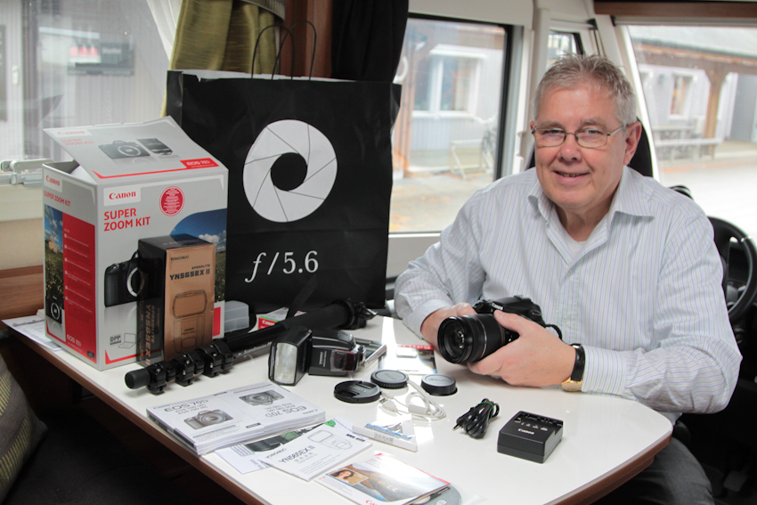 Ny kamera Canon EOS 70D, nytt ”Turistobjektiv 18-200″*, ny blixt, nytt enbensstativ, extra minneskort, extra batterier och UV filter. Vad bra med en husbil, jag kunde i lugn och ro, sitta och plocka samman allting. Tre gånger gick jag tillbaka och kompletterade inköpet. *Turistobjektiv innebär möjlighet till foto på korta, breda och motiv lite längre bort, allt utan att behöva byta ”glasbit”.