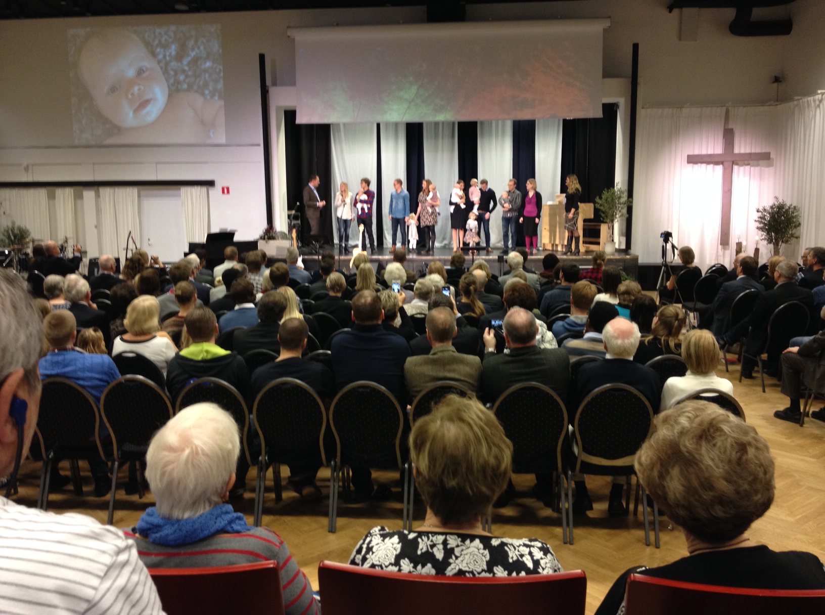 Barnvälsignelse, fyra barn, fyra familjer, i gudstjänsten. (misslyckat mobilfoto)