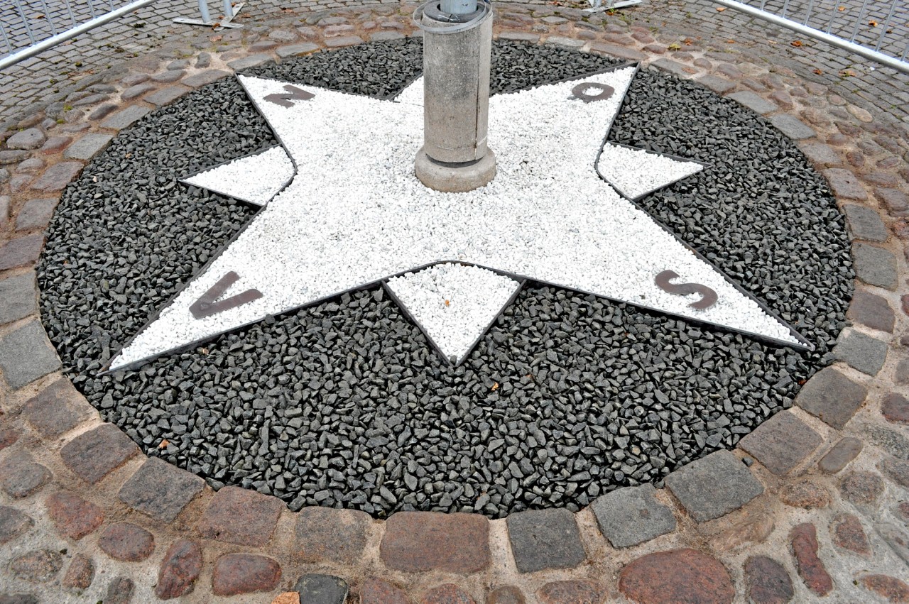 Det har länge varit planteringar i den rondell som befinner sig där Storgatan och Köpmangatan möts. Men nu syns ett nytt inslag, nämligen en grusbelagd kompass.