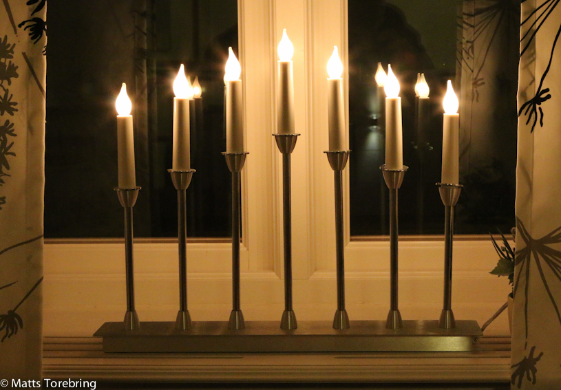 Birgitta har ett pyssel med att placera ut mer än 30 adventsljusstakar i alla fönster på kontor och fikarum.