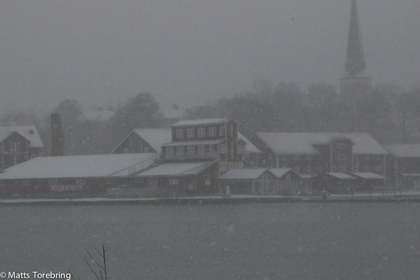 När vi äter frukost kom snön till Motala.