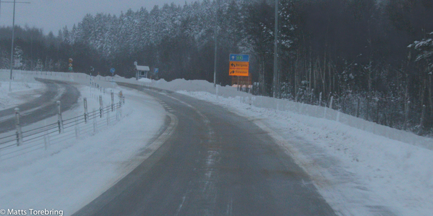 Största delen av E 4:an norröver, är två plus en väg. Ofta saktade jag in och gick in i parkeringsplatser, för att inte skapa kö bakom mig, när jag kör i bara 70- 80 km och framför allt för att släppa fram mina tidigare yrkesbröder. Jag var tvungen att välja parkeringsfickor i nedförsbackar för att komma ut, då det bara slirar på blankisen. För bussar har man sandat på busshållsplatserna samt i vägkorsningar som ovan för att underlätta.