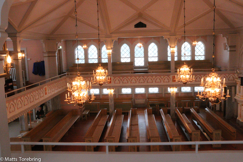 Den vackra träkyrkan sett från läktaren