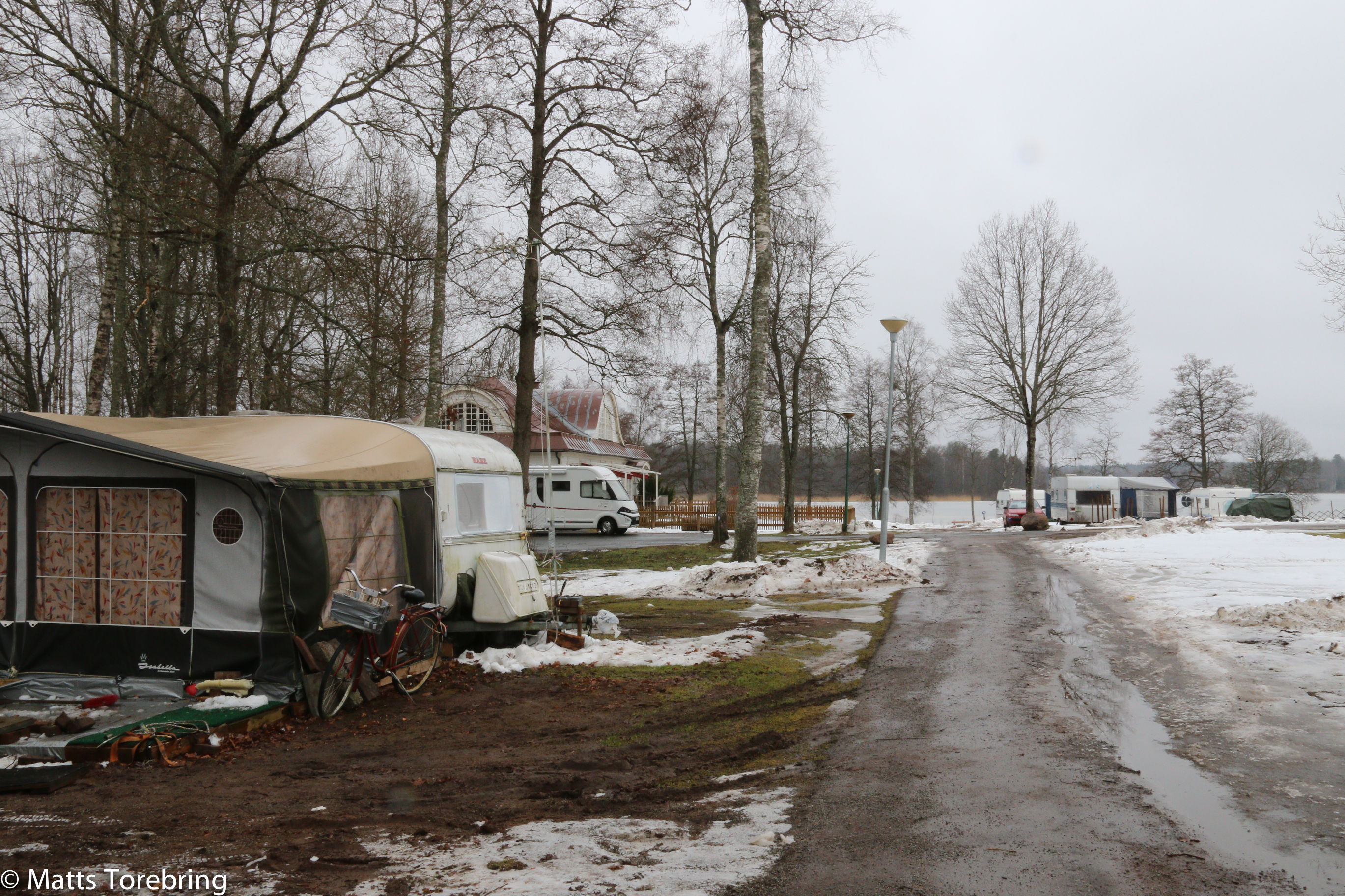 När vi kom till Eksjö Camping på fredagskvällen var elen avstängd på ställplatsen. Ingen svarar i telefon, vi försöker ta en campingruta, men det slirar i snön och det blöta gräset under. Vi har tidigare parkerat på asfalt utanför Vandrarhemmet, nu gjorde vi det igen.