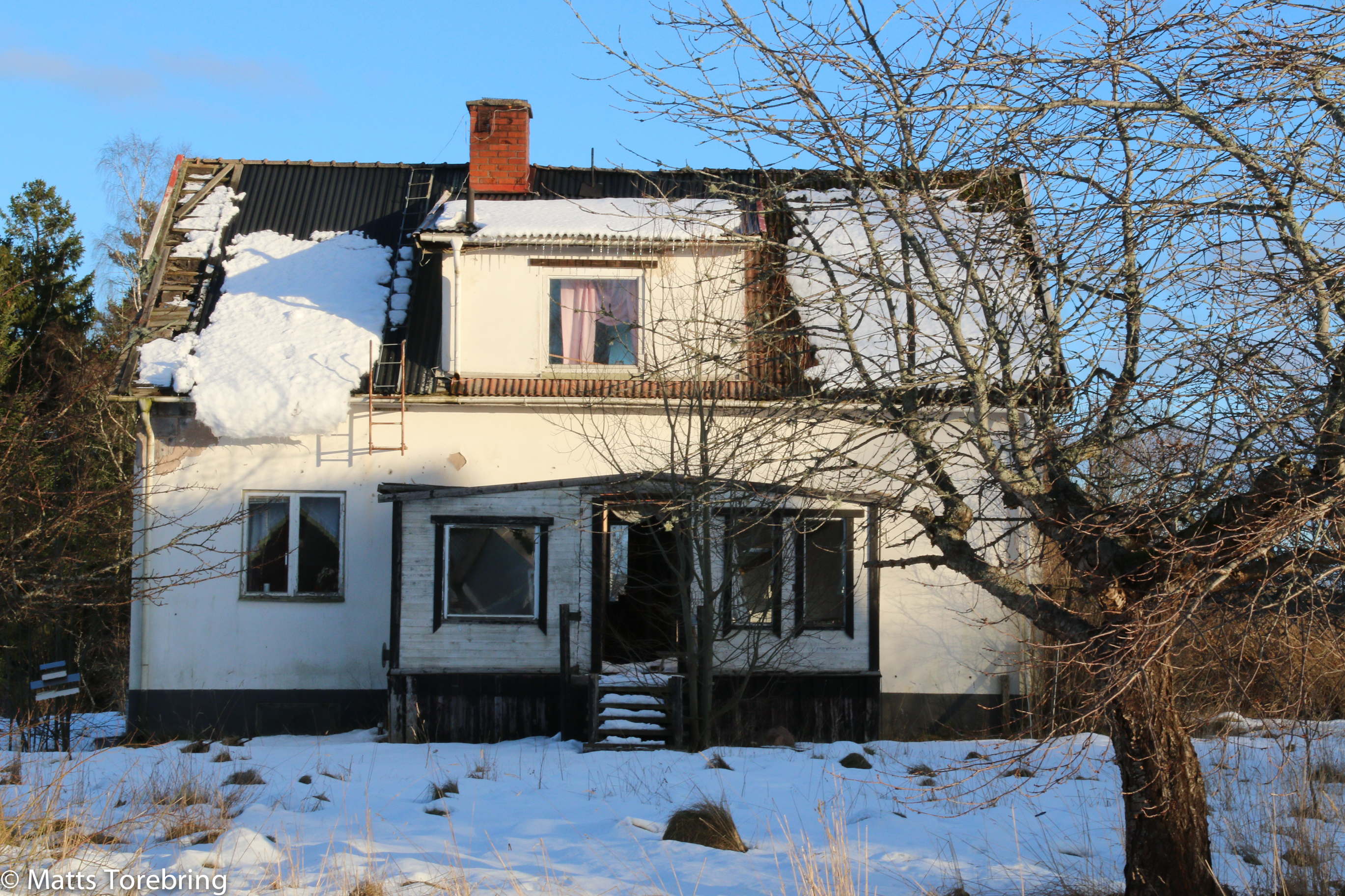 Jag kan inte bakgrunden och de förmodligen rådande  tråkiga omständigheter, som säkert finns kring detta hus. Jag vet bara att det stått så här länge, kanske tio- talet år eller mera. Huset står mitt i ett bostadsområde, mitt inne bland andra trevliga villor. Lägg märke till att även ytterdörren saknas.