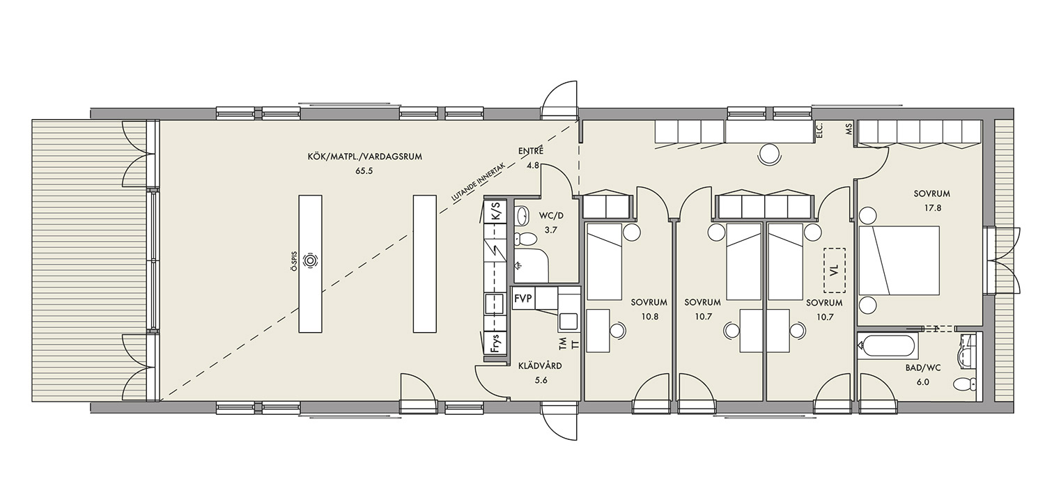 Vilken planlösning, ett sovrum bort och lite små justeringar och det hade varit perfekt. Ett lika utformat hus bredvid, bara lite lägre och kortare hus och med plats för en Kabe Travelmaster som körs in från kortsidan. Kunde det ha blivit bättre? Jag har talat om att vilja bo på landet. Detta hade blivit att bo på landet i en ”Ekonomibyggnad”.