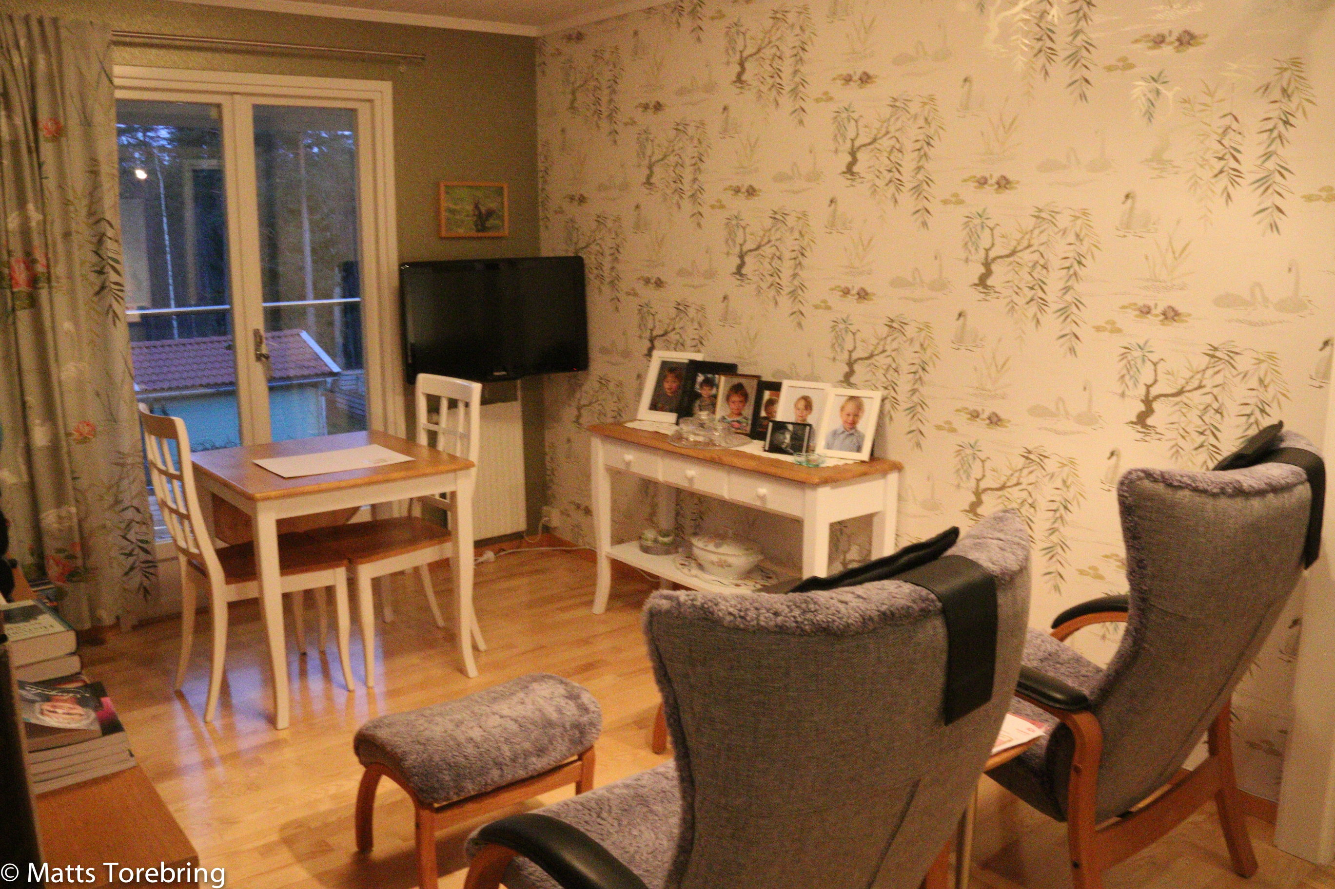 Det tidigare köksbordet och buffén passade in i tv rummet. Här kan Birgitta och jag sitta och dricka morgonkaffet vid fem- sex tiden när vi är hemma och se solen gå upp i öster.