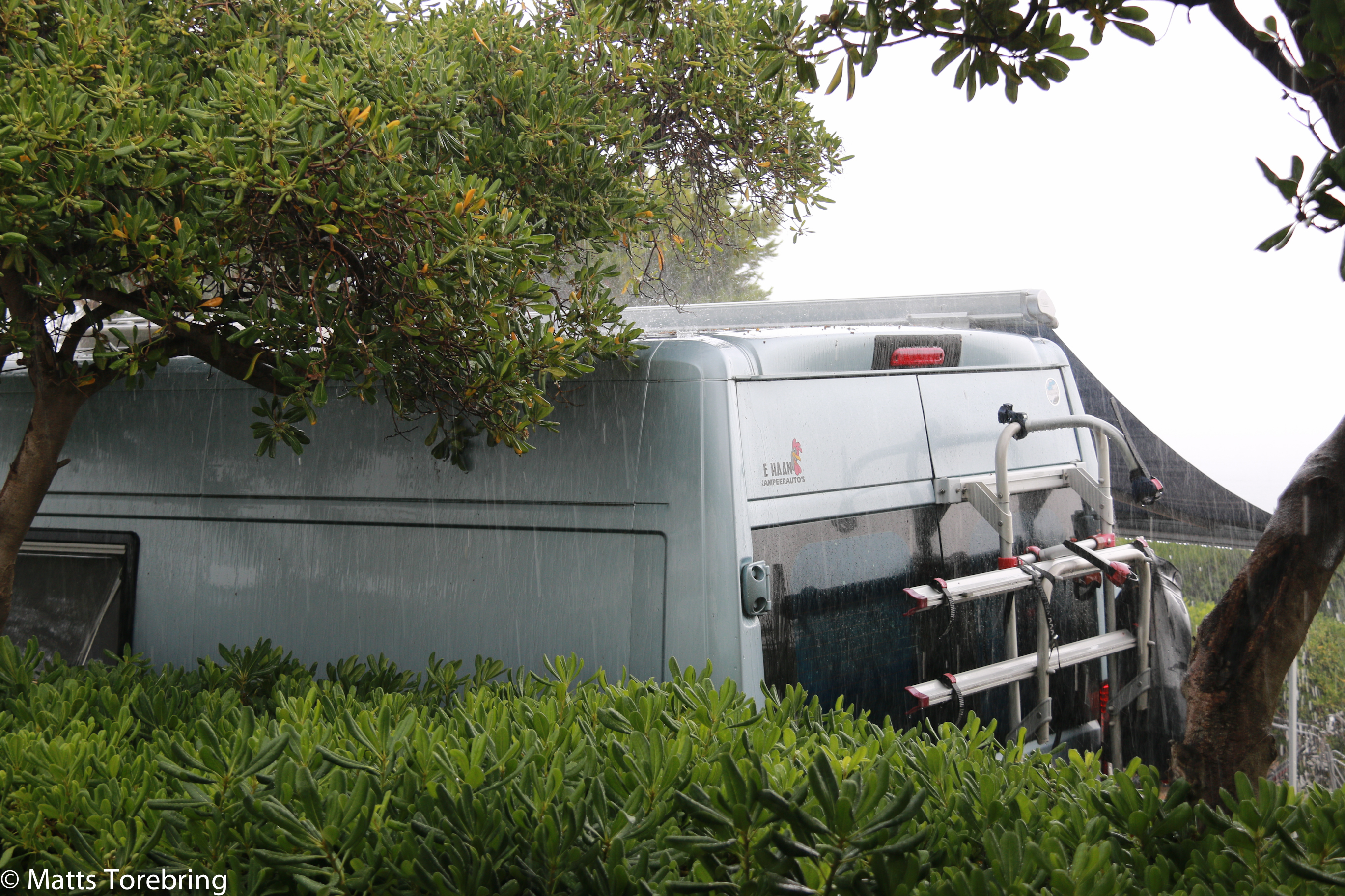 Vattnet kom uppe ifrån backarna och rann in under vår bobil.