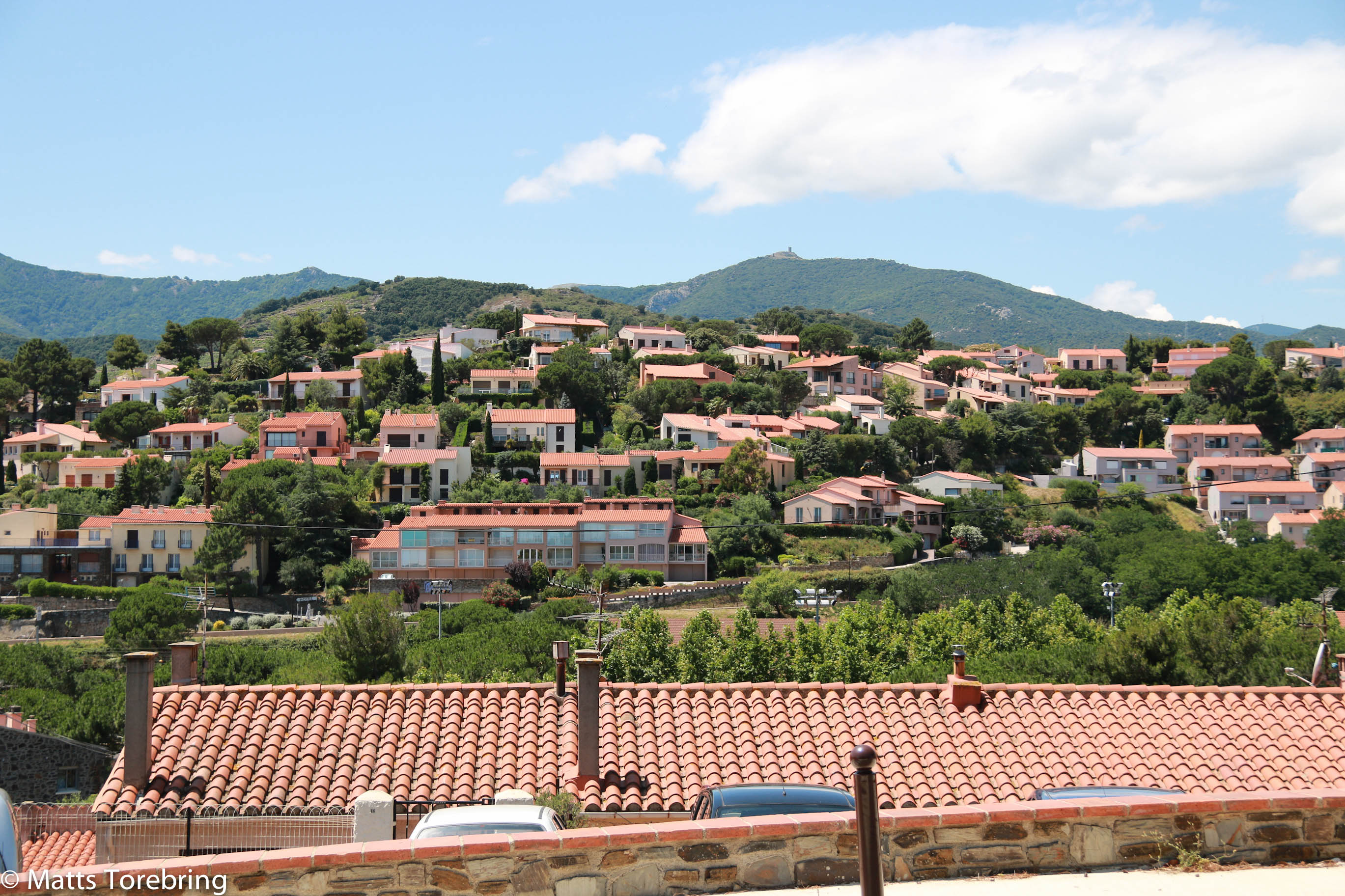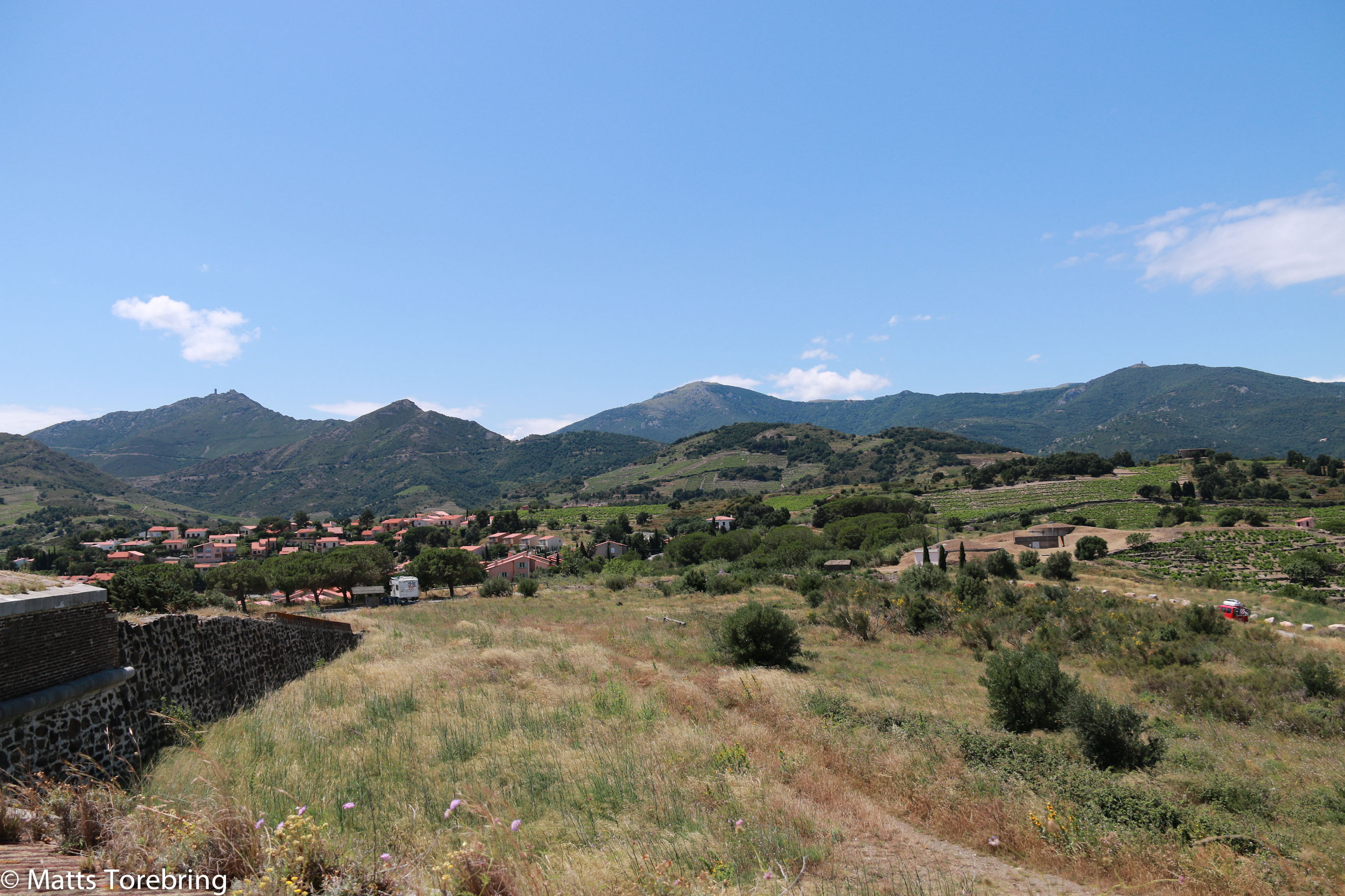 Pyrenéerna i bakgrunden och första husen i Collioure.