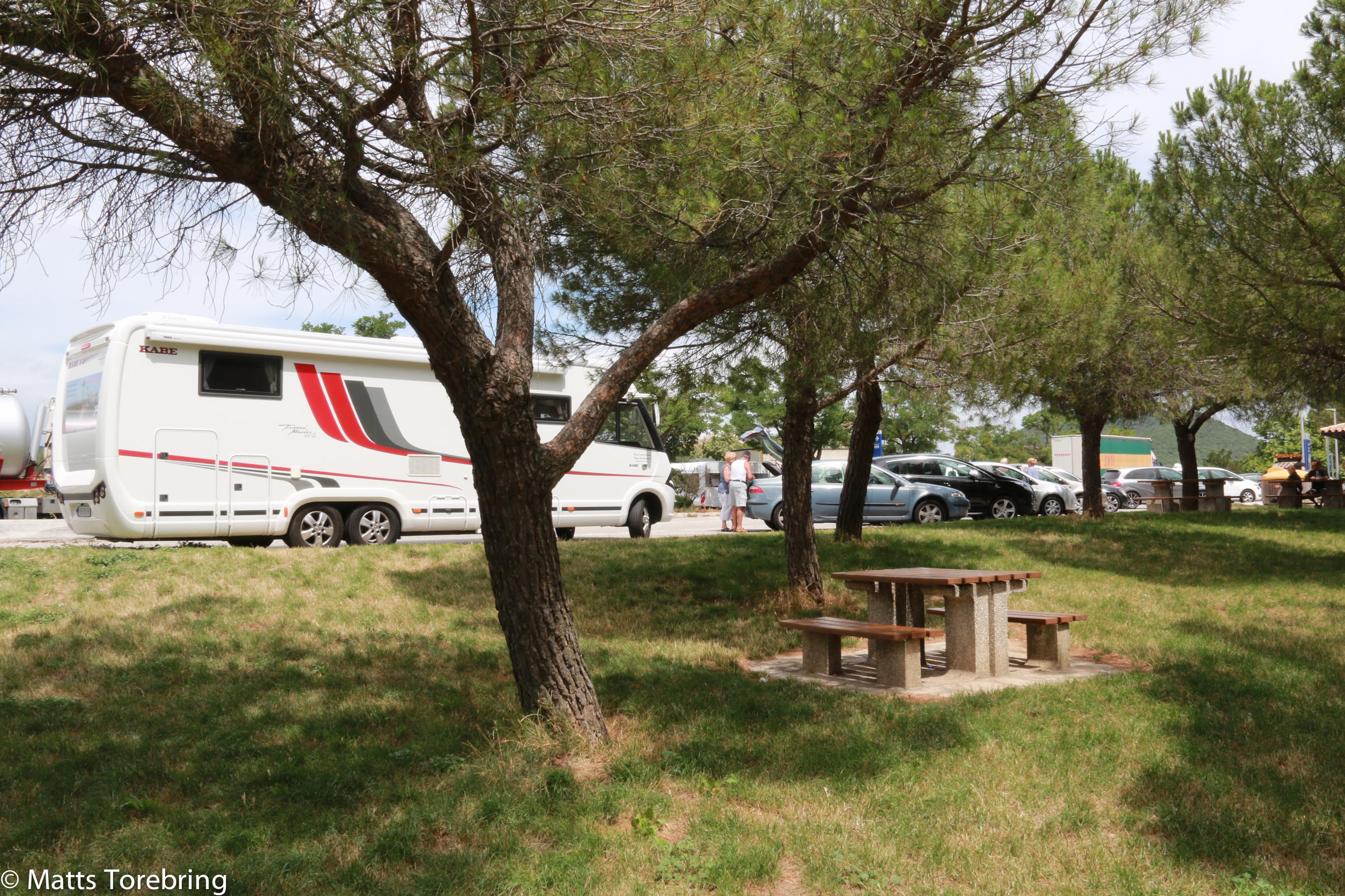 Vi har varit inne på franska rastplatser, där det tagit tio minuter eller mera att komma ut igen på stora vägen. Snurra runt, snurra runt, snurra runt, vart är vi, vart skall vi köra och så vidare. När jag såg denna lilla rastplats trodde jag inte att jag var i Frankrike längre. Jag bara stod och skrattade för mig själv.