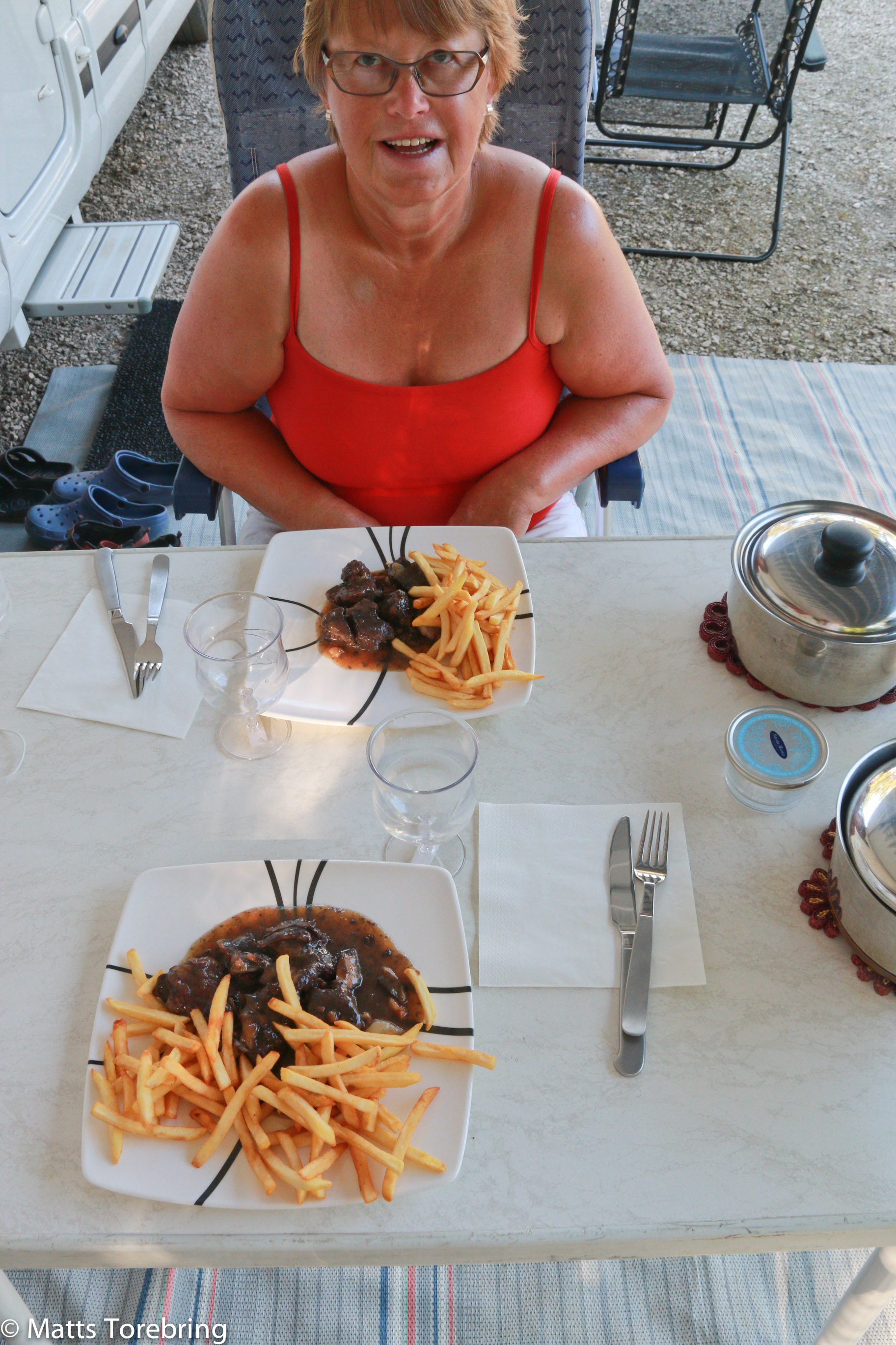 På Camping L´Eperviéere beställde vi Take Away, Köttgryta Bourguignon sista kvällen. Jag hade med mig en två liters och en 1,5 liters kastrull. Den ena fick vi halvfylld med köttgryta, den andra överfylld med pommes. Jag har sällan eller aldrig ätit mig så mätt. Jag har av mor fått lära mig att inte lämna mat på tallriken, men vi klarade inte äta upp allt. Det var himmelskt gott, det kan vi lova. Pris 9,50 €! Kanske kommer jag att stanna till fler gånger, bara för matens skull.