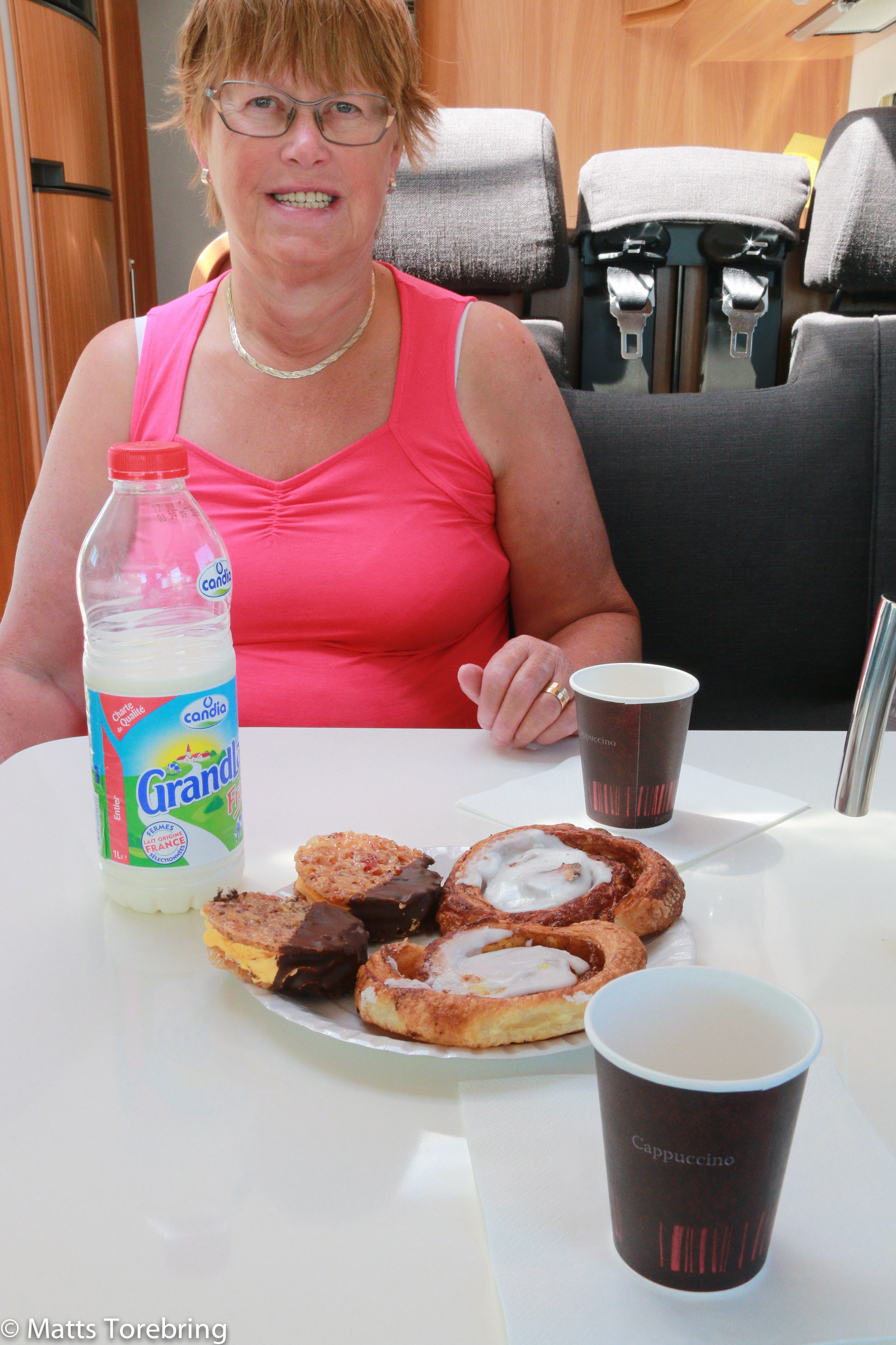 Vi åt frukost i hamnen och att fika med Danska wienerbröd var inte att tänka på. Vi tar in på första rastplatsen efter bron, för att fika utanför Malmö. Stor rymlig rastplats, men inte ett bord fanns för att sitta ute. MYCKET DÅLIGT, tycker vi. Wienerbröden var gigantiska och så mycket gott i, att det var på gränsen att jag klarade äta upp. Kakorna fick vi spara.