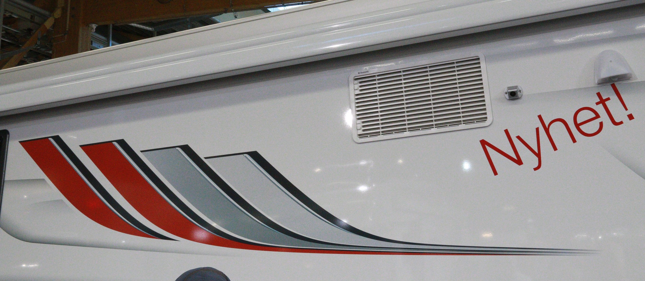 Tidigare var dekoren stripad, nu är den ursnyggt lackad. Jag fasar för brons- & grålackade husbilar. En husbil skall vara vit och otidsenlig. Titta på en Kabe husvagn -84, den är lika up to date idag, över 30 år senare.