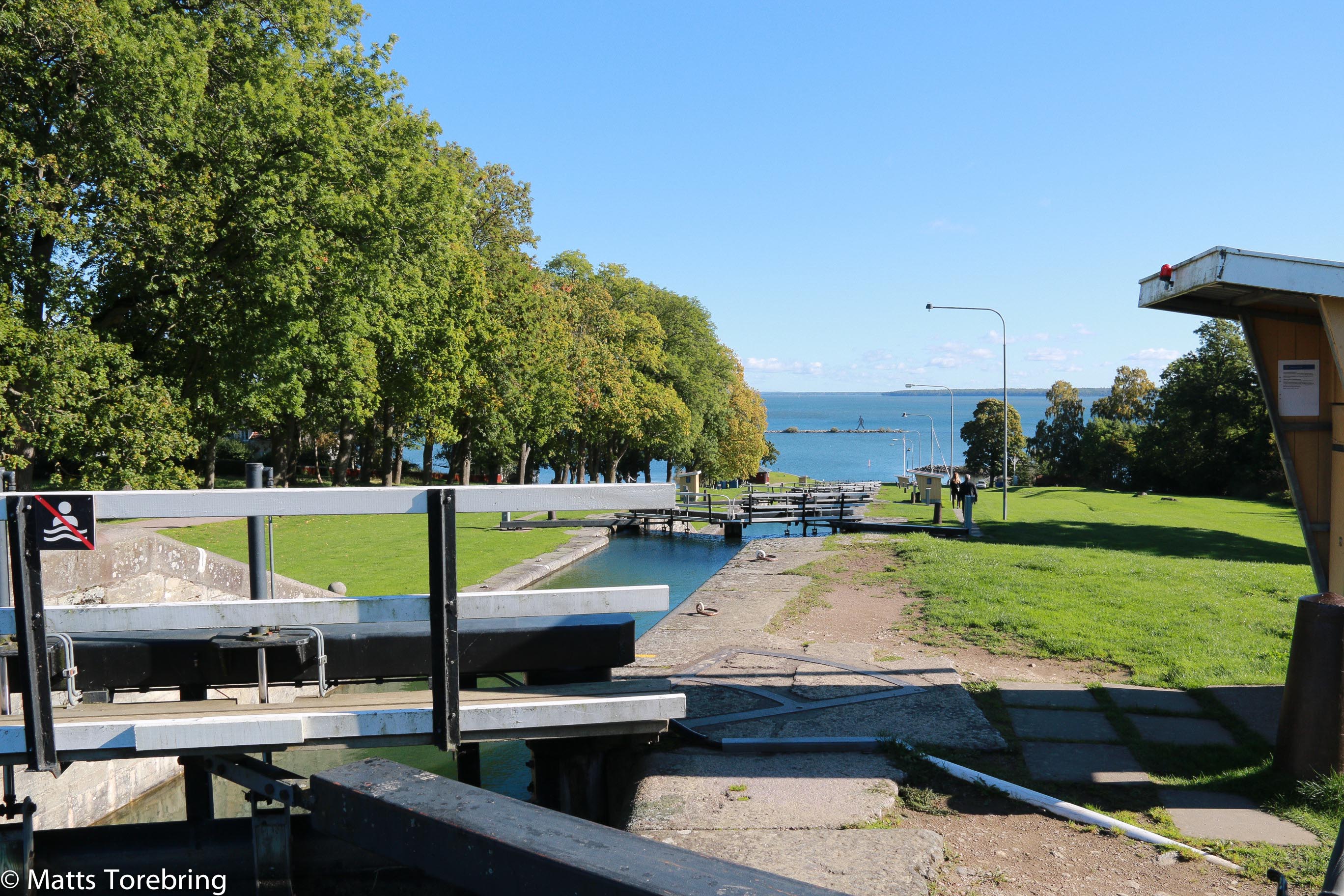 Jag räknade inte hur många slussar, det är ned till sjön, men de är många framme i Berg.