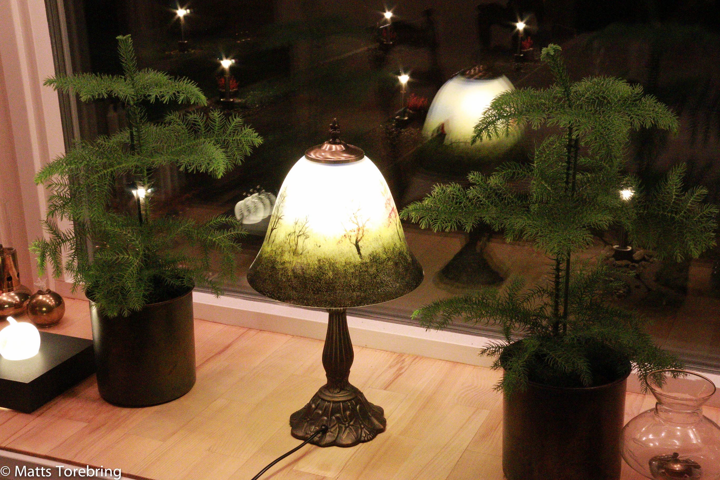Återplanterat har vi redan gjort, fast inne i vardagsrummet. På Växtkraft i Vetlanda hittade vi dessa ”innegranar” med krukor i stil med lampan