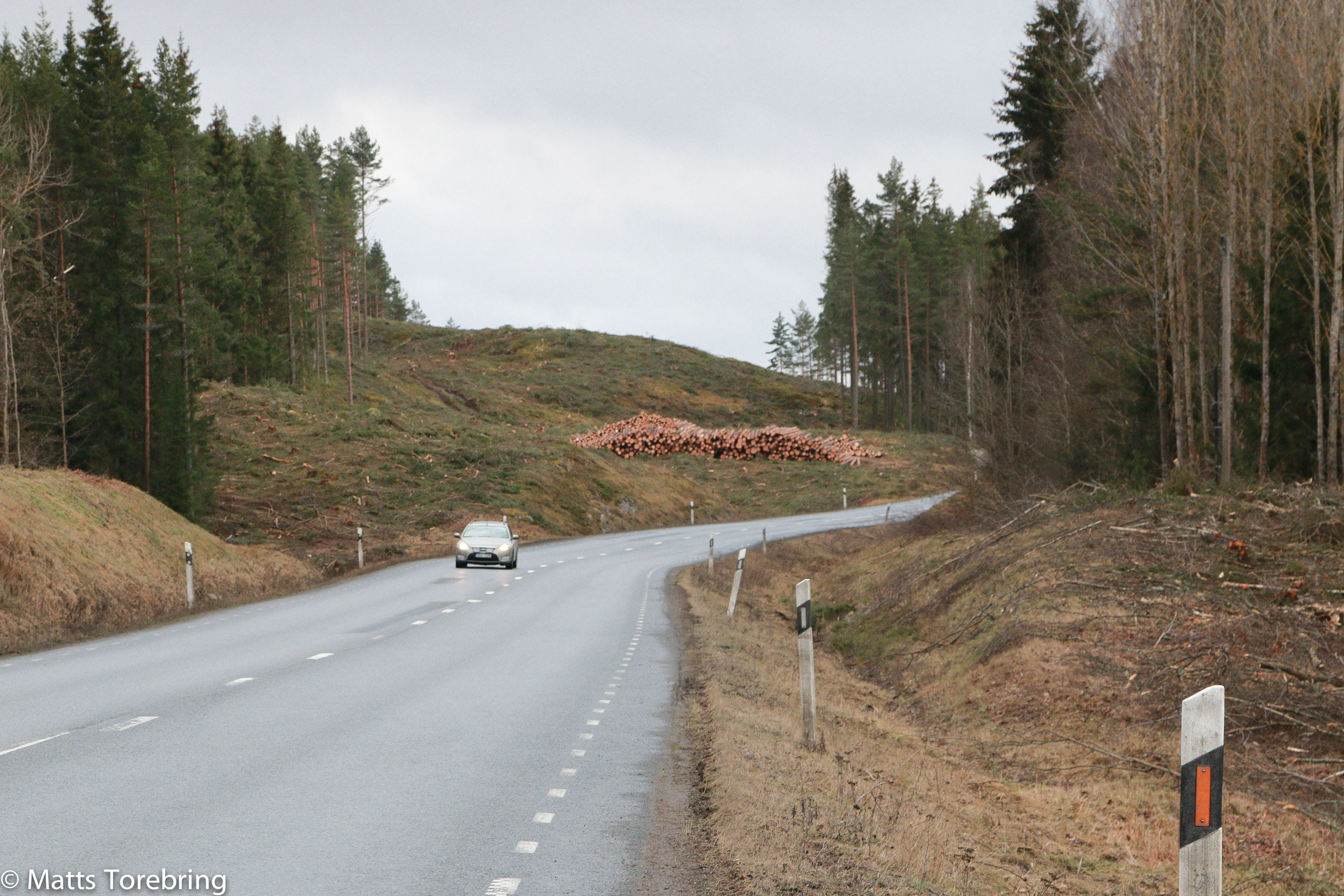 Jag hade själv hoppats på, att även den branta backe, som finns bakom mig och kameran, skulle omfattas av ombyggnaden. Så ser det inte ut idag, men det kanske sker senare. Nere där backen börjar i en djup svacka, finns en extremt farlig korsning med mängder av riktigt tunga lasttransporter med släp, från ett Ballast företag. (krossat berg). Dessutom är det ett viltstråk för älg just där. Jag har själv kört ihjäl en stor älgtjur där nere och varit vittne till minst tre andra krockar med älg i just den svackan. Jag har dessutom sett älg där, utan att köra på dem. Även andra olyckor och krockar har skett, i den korsningen med dödlig utgång.