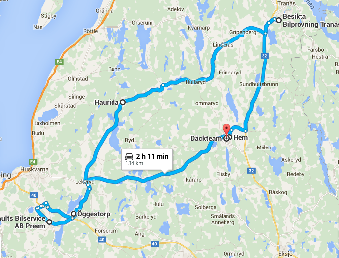 Fort som ögat på småvägar över Lekeryd, Svarttorp, Haurida, Vireda, Hullaryd, Linderås och till slut till Besikta i Tranås. En kvart till godo. Besiktningen gick bra och utan påpekande. Lika bra att fortsätta engagemanget. Jag ringde Däckteam, Aneby. Kan ni göra Ditec behandlingen på vår Kabe nu? frågade jag. Ja det går bra, kom du! Där tog resan slut. Så fortfarande står vi här, utan att vara klädda, ingen Kabe står på gården.