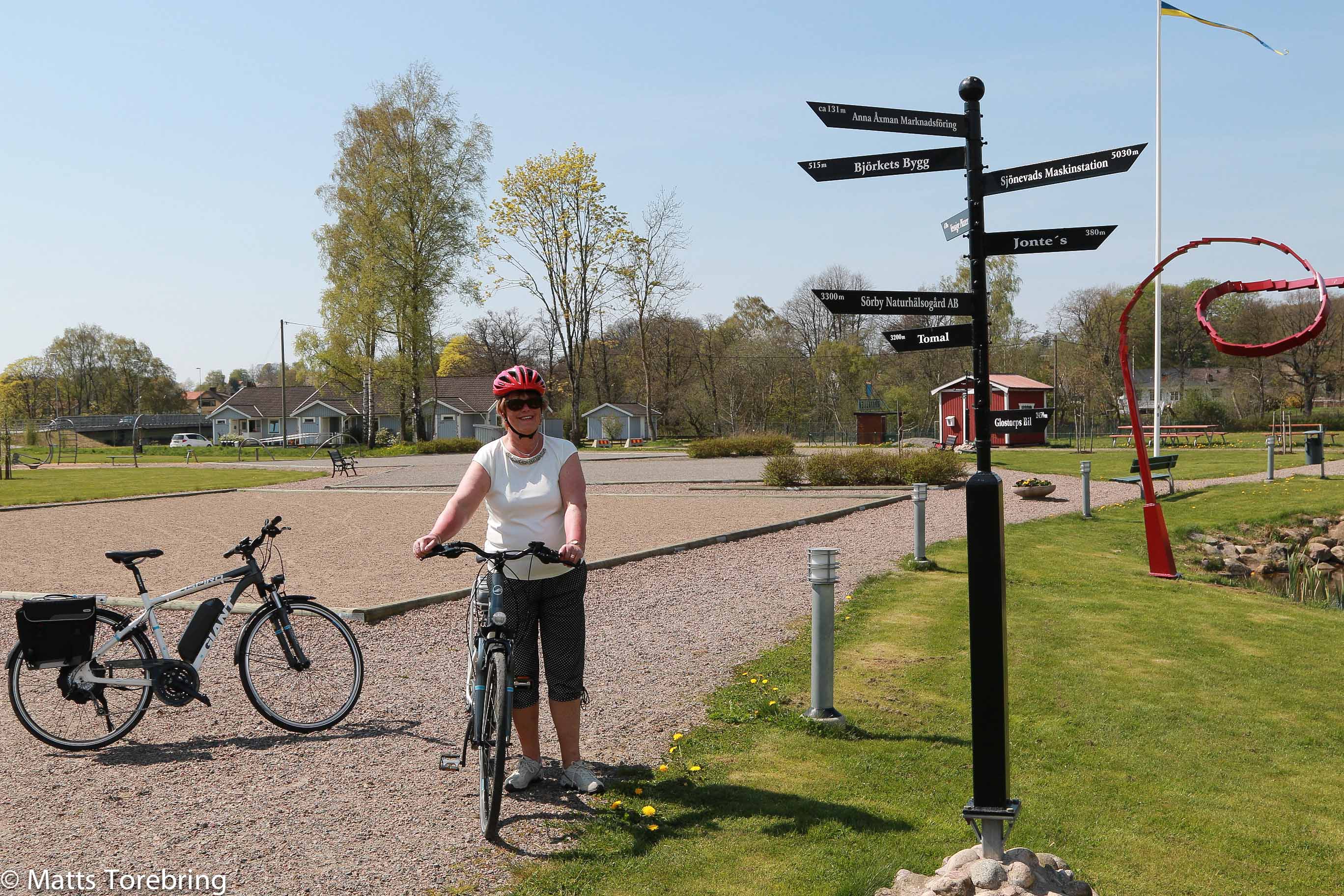 Efter Kabeklubbens årsmöte idag tog vi en liten cykeltur. Här har vi stannat i lekparken. Fina vägvisare till byns sevärdheter.