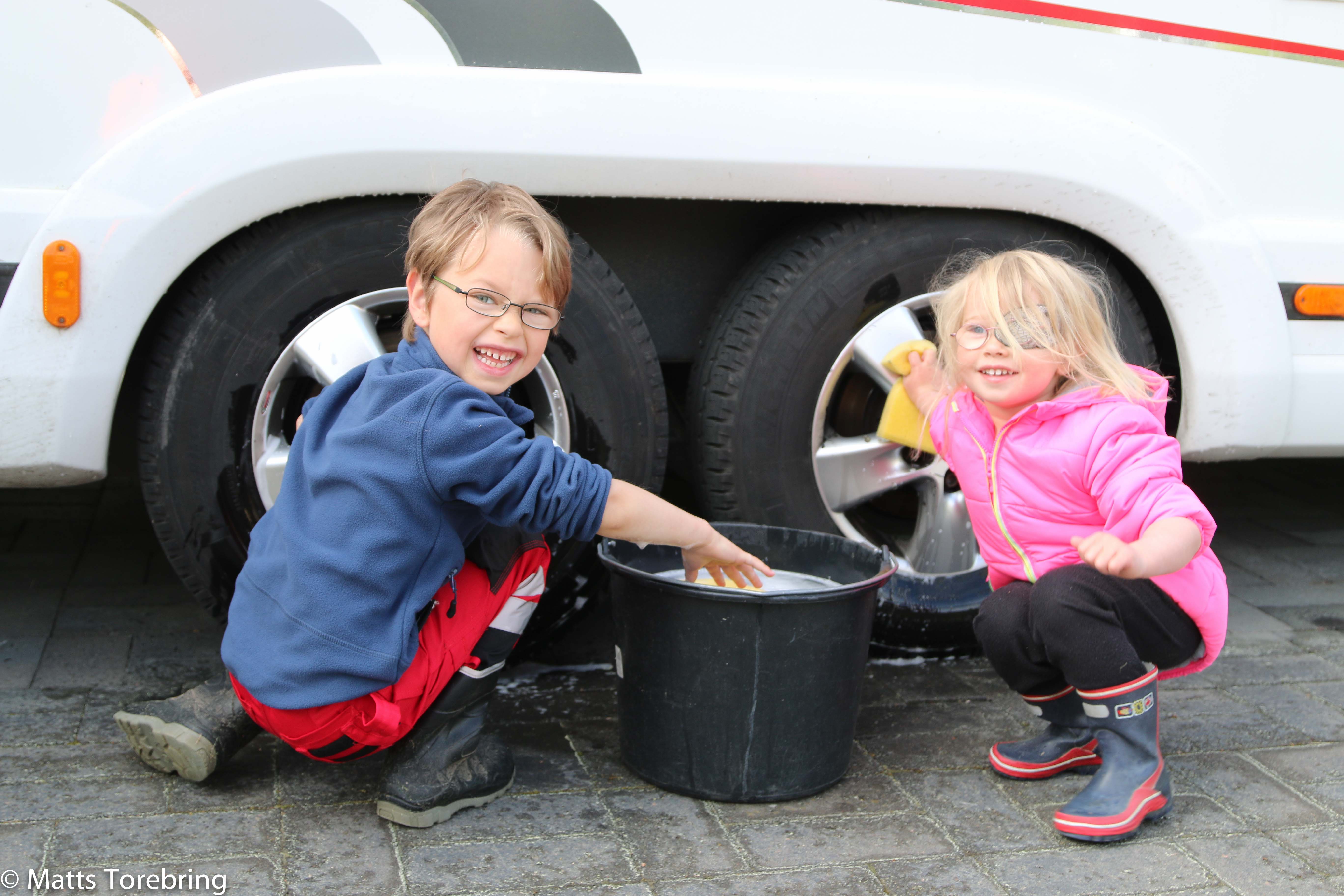 Själv var jag ute ganska tidigt idag. Jag vet, att göra listan är lång inför semestern. Ingen vill väl åka i en smutsig husbil på semestern. Jag var inte ute lång stund förrän Oliver & Nelly kom ut och ville hjälpa till.