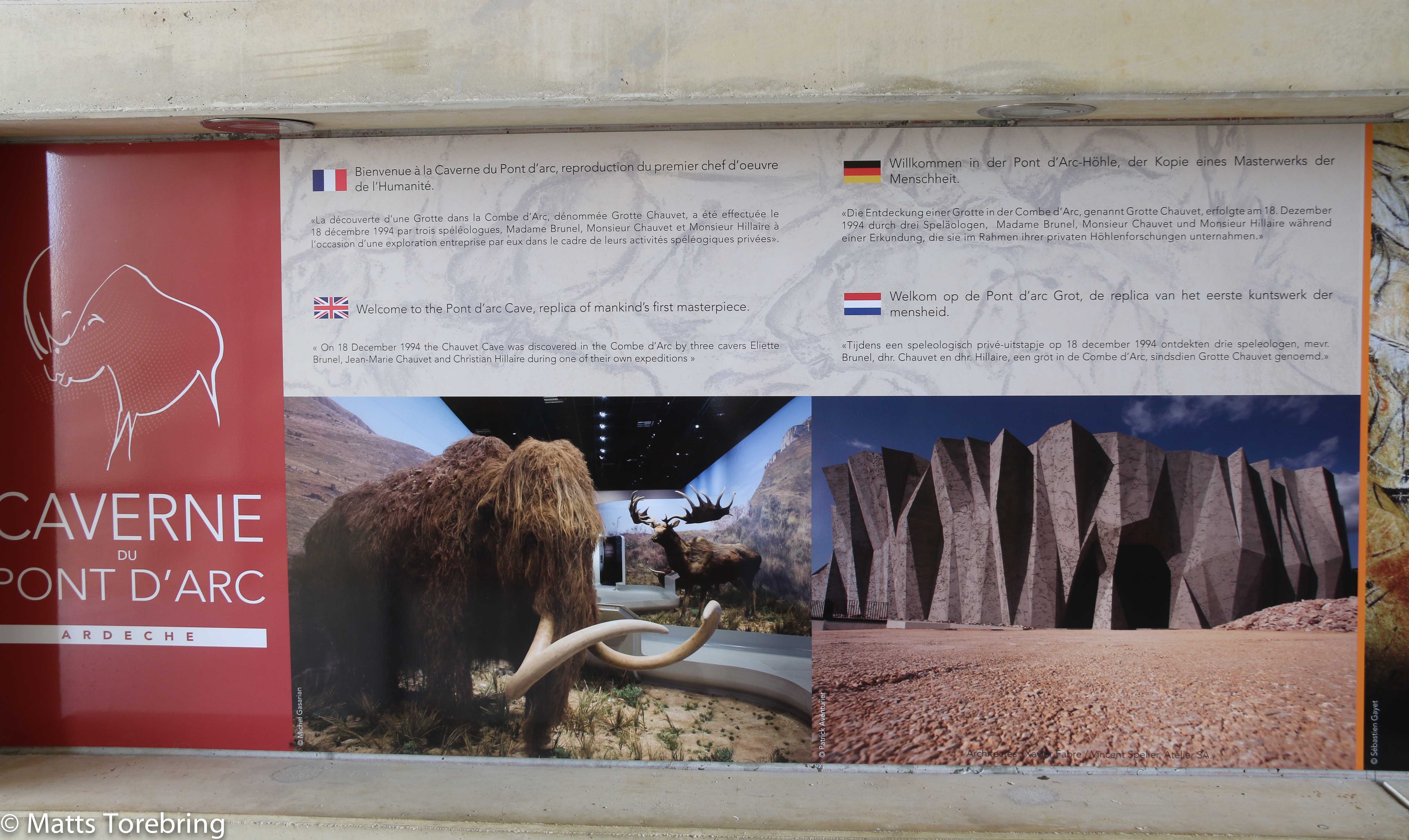 Guideningen tar 55 minuter. Det vi har sett här inne, är svårt att beskriva. En miljö som stått stilla i 36000 år om forskarna har rätt. Grottan upptäckes först 1994, se filmen nedan. Här inne finns inristat i väggarna hästar i meterformat, som ser ut som vilken ardennerhäst som helst hemma i Småland. Det finns inristade lejon, renar, hjortar, apor, elefanter, målningar och en massa andra djur. Det finns avtryck av hela människor i väggarna. På marken ligger kranier av djur och stora ben. På flera ställen är väggarna och taken fulla av glimrande ”Istappar”, som formats under årtusenden. Fotoförbud råder, så se alla bilder på nätet.