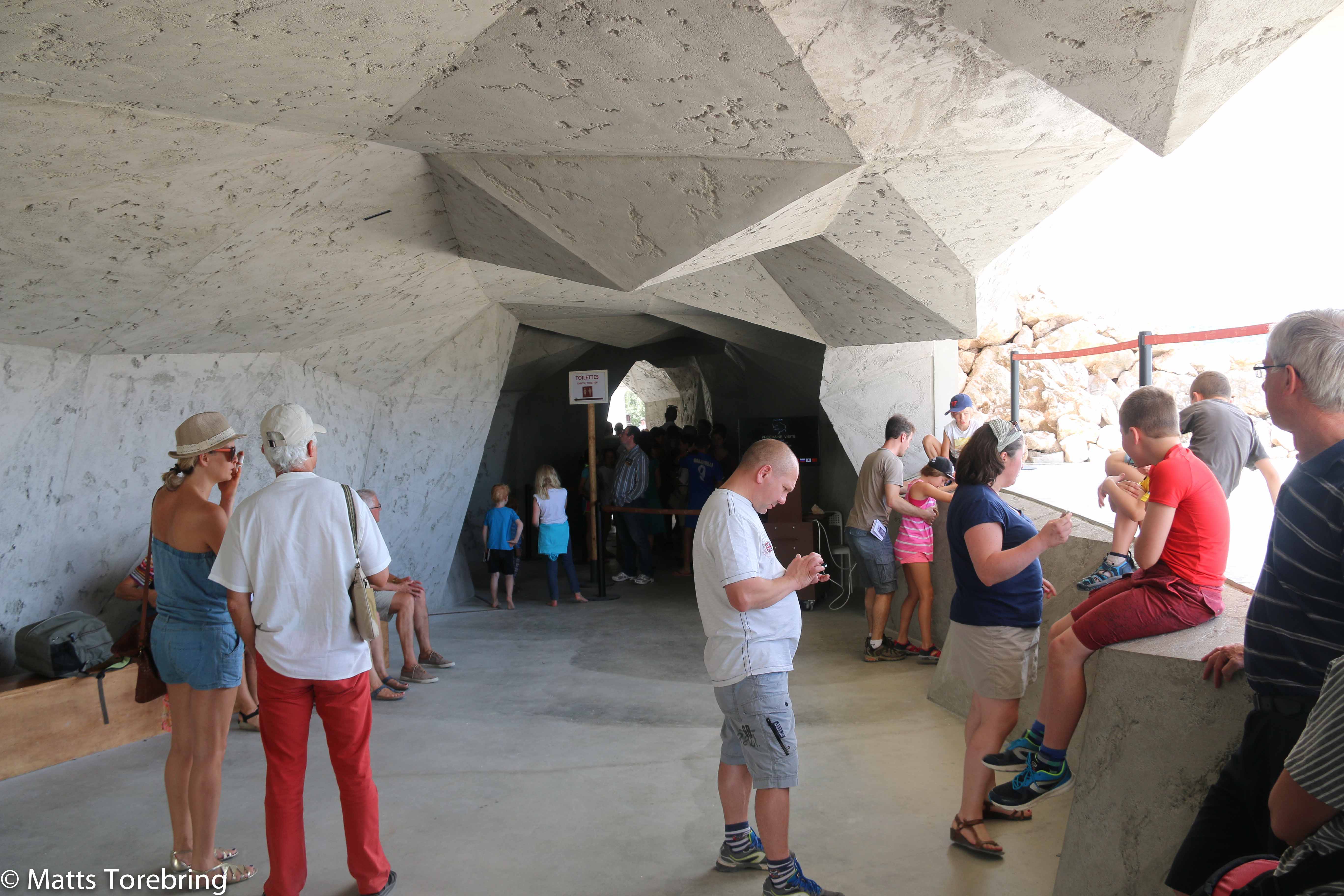 Detta är vägen fram till entrén. Det känns som, att man här ute bland bara buskarna, byggt ett skydd över grottan, som skall tåla en atombomb. Här finns i olika byggnader, butik, bar, restaurang och lokaler för grupper.
