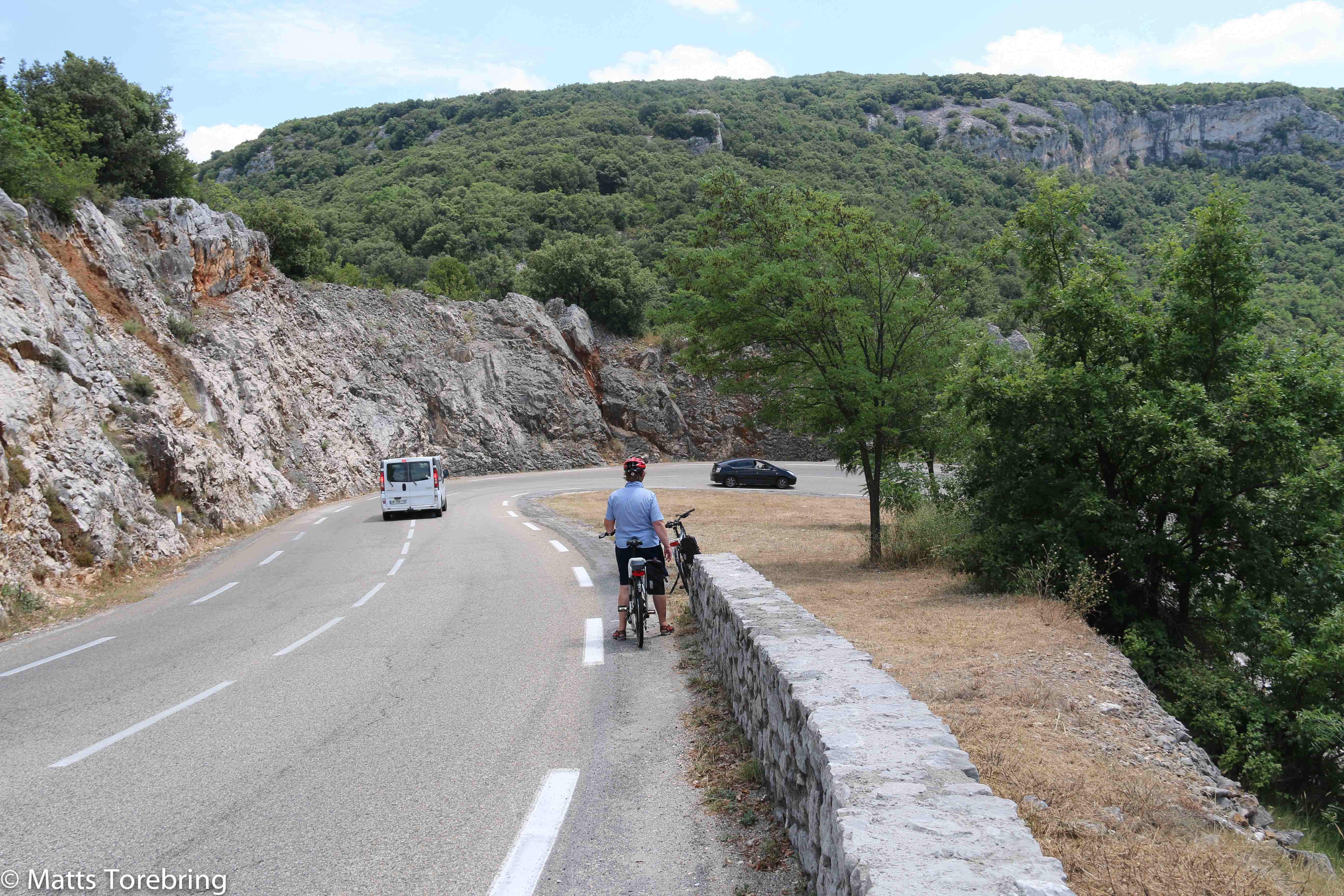 Solen var stekhet. Våra fina elcyklar med 24 växlar arbetade på i backarna. Ganska mycket trafik. Vi tog det sakta och mycket försiktigt, att vurpa här i detta stenlandskap, vill ingen av oss göra. När vi kör hem är det bara bromsa som gäller.