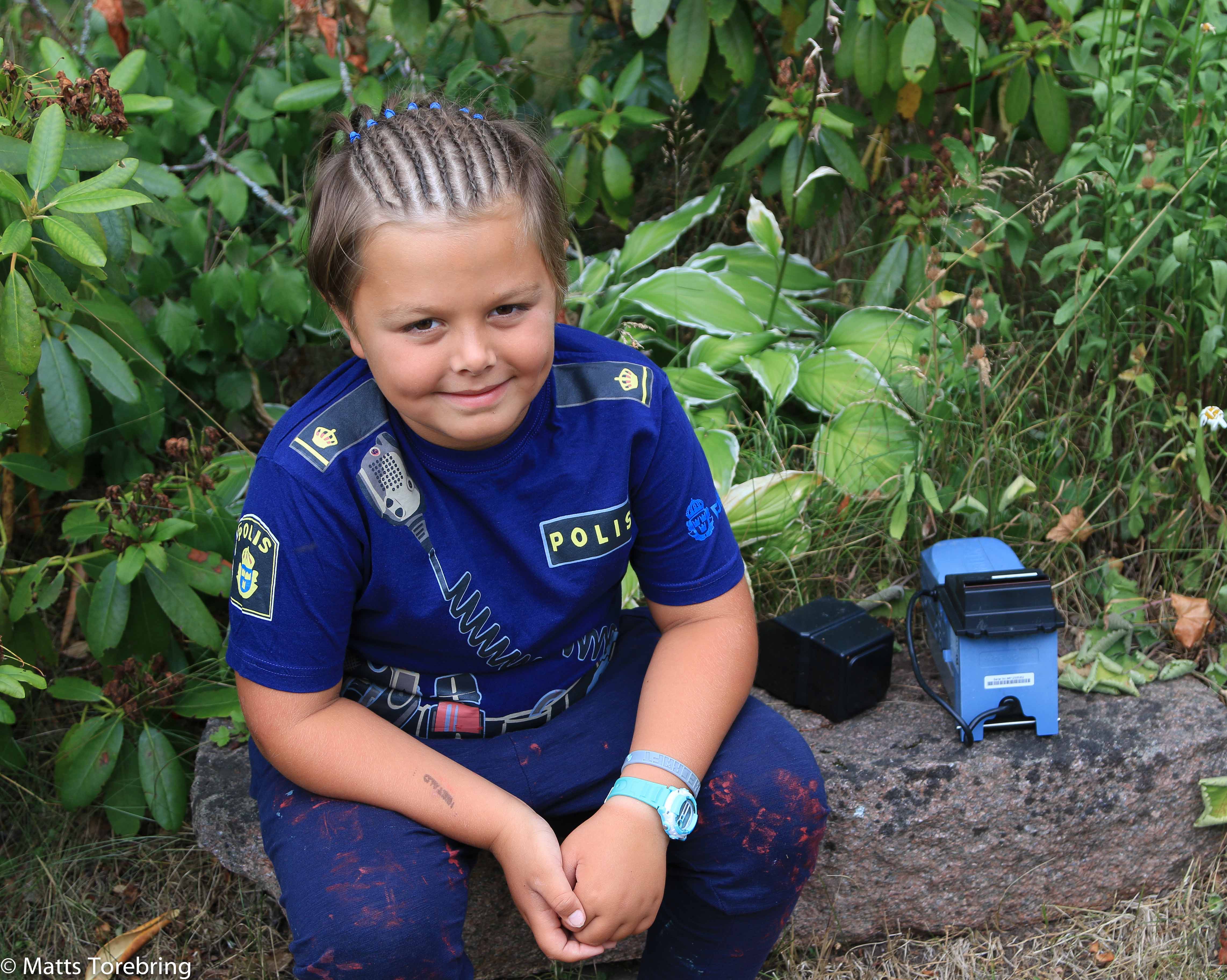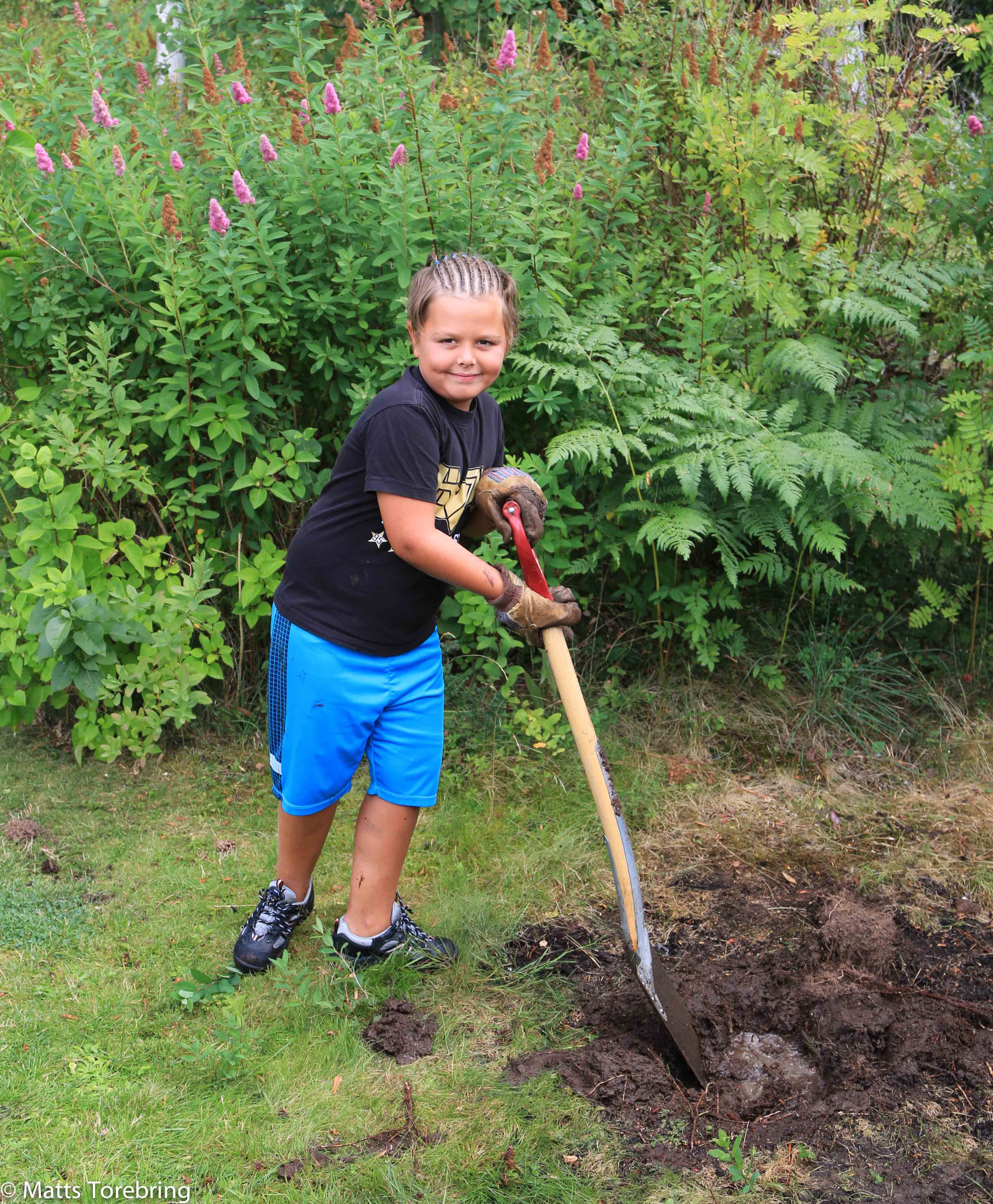 Det första vi möter, är Linus som håller på att gräva en grov i trädgården. Jag skall gräva en brunn, sa Linus och fylla den med vatten, flaskor och burkar. Den fina frisyren har en tjej på hotellet på Cypern fixat till.
