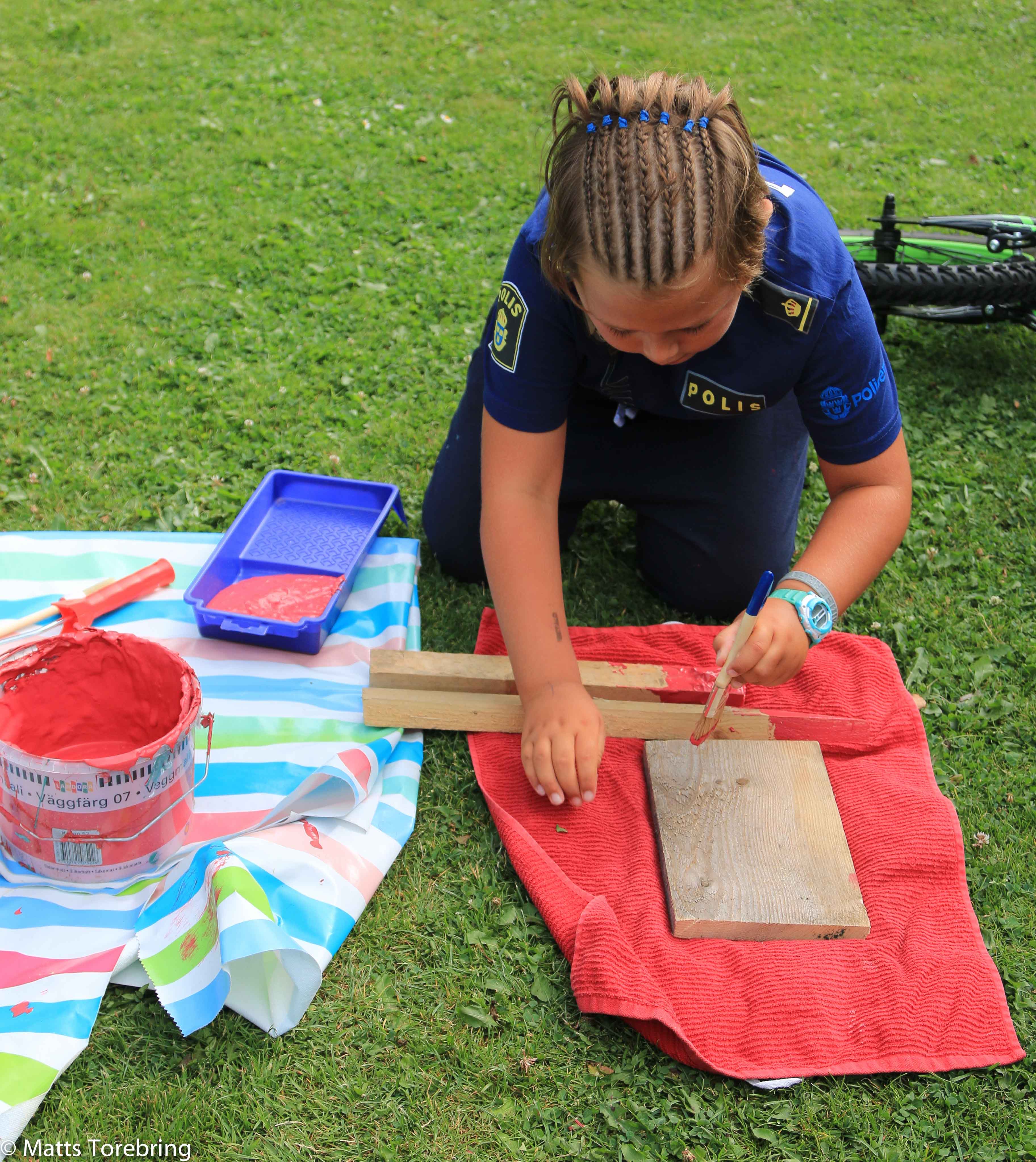 Linus rör om i färgburken och fyller färgtråget med färg.