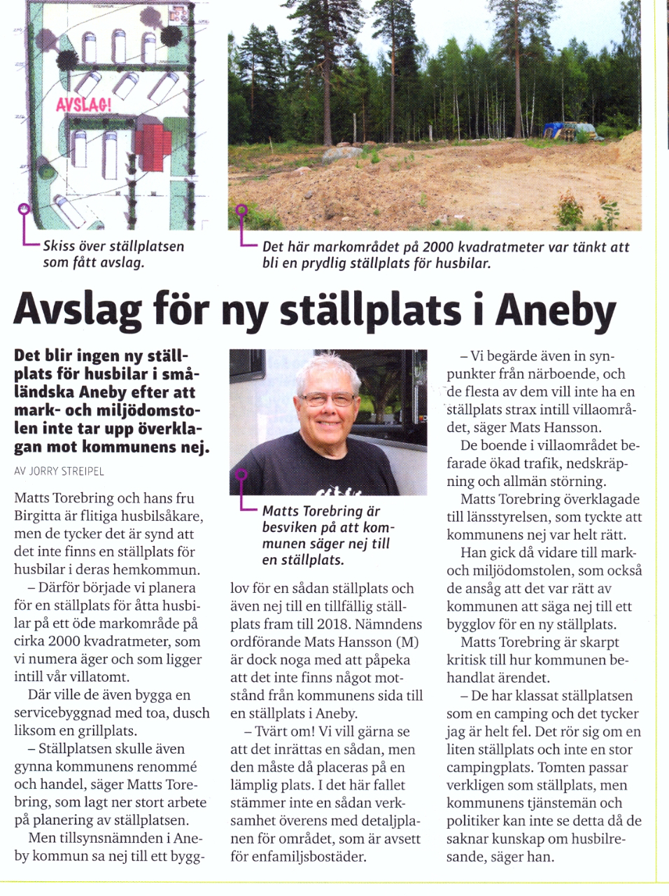 Jag blir både ledsen och arg, när jag läser kommunens politiskt tillsatta ledamöter och tjänstemäns uttalande. Aneby vill inte ha en Ställplats i centrum av byn! En till två av kommunens tjänstemän har gjort allt, som stått i deras makt, att stoppa detta projekt. I stället för att vara ärliga och att skapa positiv opinion, har man gjort raka motsatsen. En person har bestämt sig för att vara emot och sedan viner partipiskan.