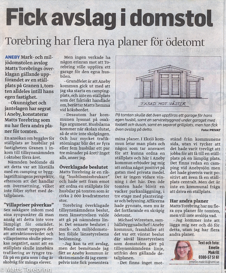 Nu sätter jag punkt tills vidare. Tack alla ni som stöttat mig i denna fråga, engagerat er i mejlkontakter och telefon med kommunala tjänstemän. Tack till fack- & ortstidningar för ert engagemang. Tack alla husbilsvänner som stöttat mig. I dag får Aneby kommun stå vid skampålen. Jag har gått en kamp mot byråkratin och förlorat. Förlorat har även alla som bor på gatan och hela kommunen i stort. I stället för en vackert planerad tomt i tre etage, med stenmurar, belysning och planteringar, ligger det nu bara grushögar. Hur kunde det sluta så här? Eller är det kanske inte slut här? Vänta och se!