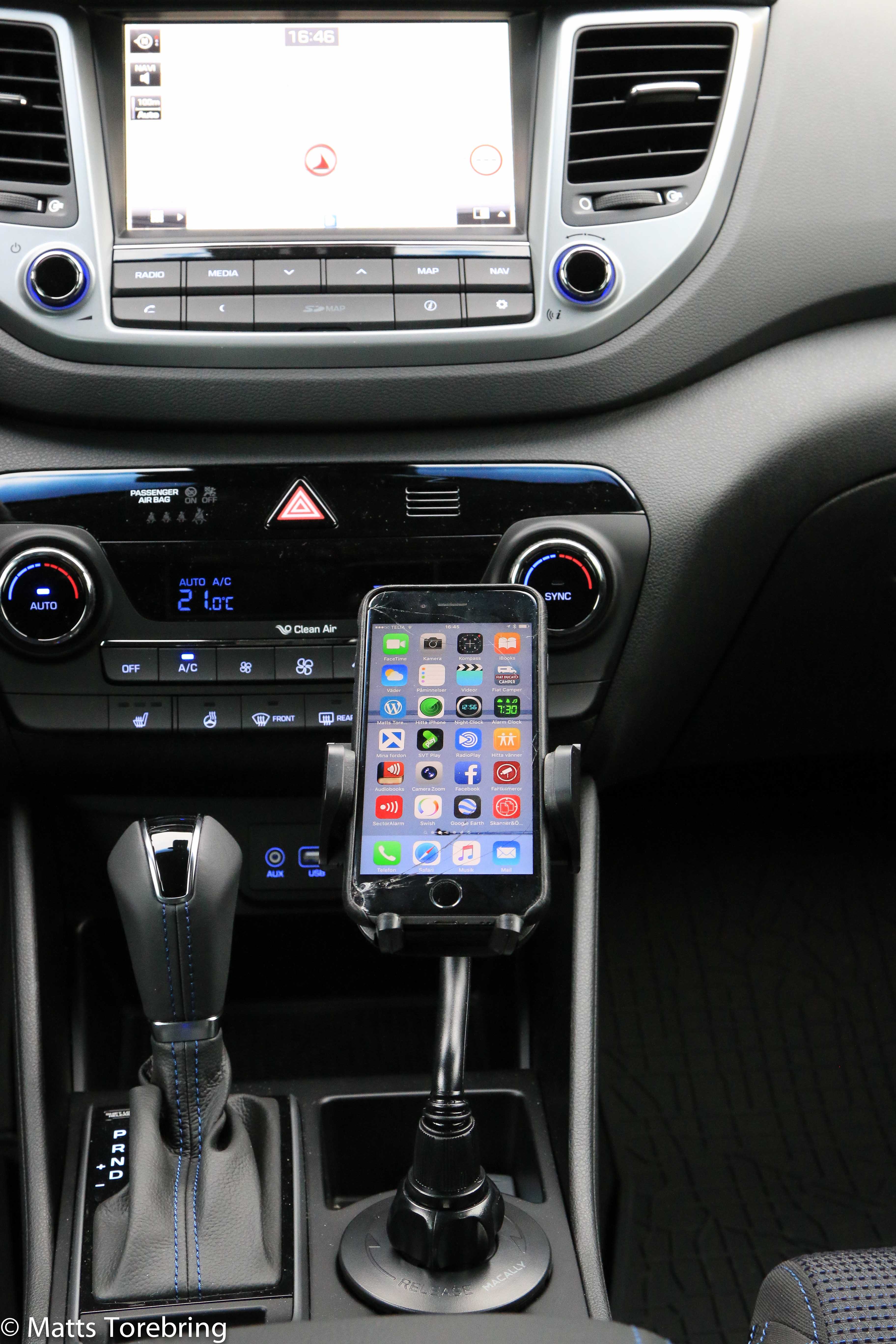 Inga verktyg, inga små skruvar att tappa bort, inget estetiskt störande hållare i instrumentpanelen. Bara stoppa i hållaren i en mugghållare i bilen, trycka på en knapp och hållaren justerar själv bredden på telefonen, med eller utan skalskydd.