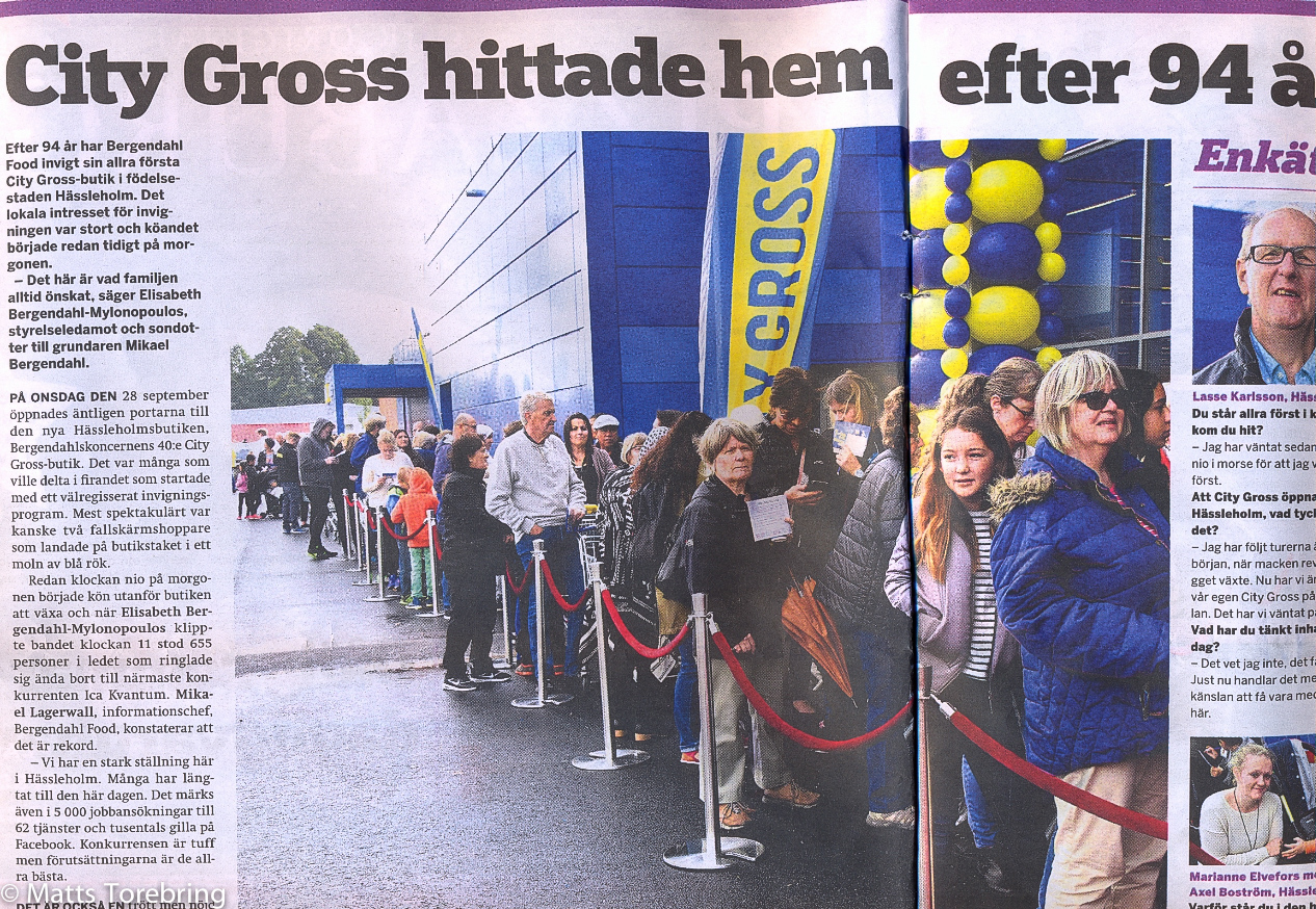 Jag har under flera år läst om Bergendahls kamp, för att få bygga sitt eget varuhus, i sin hemstad, Hässleholm. Hela tiden överklaganden och motarbetade, av det stora tråkiga monopolet ICA. Jag har skrivit flera gånger tidigare: ”Jag älskar att handla på City Gross”. Nu blev jag så glad, när jag kunde läsa, att de öppnat varuhus, i sin egen hemstad. Det är jag som oftast springer iväg och handlar, när vi reser ute i Europa. ICA butiken hemma på gatan, har jag bara  200 meter till. Jag var där senast 1992 och handlade.