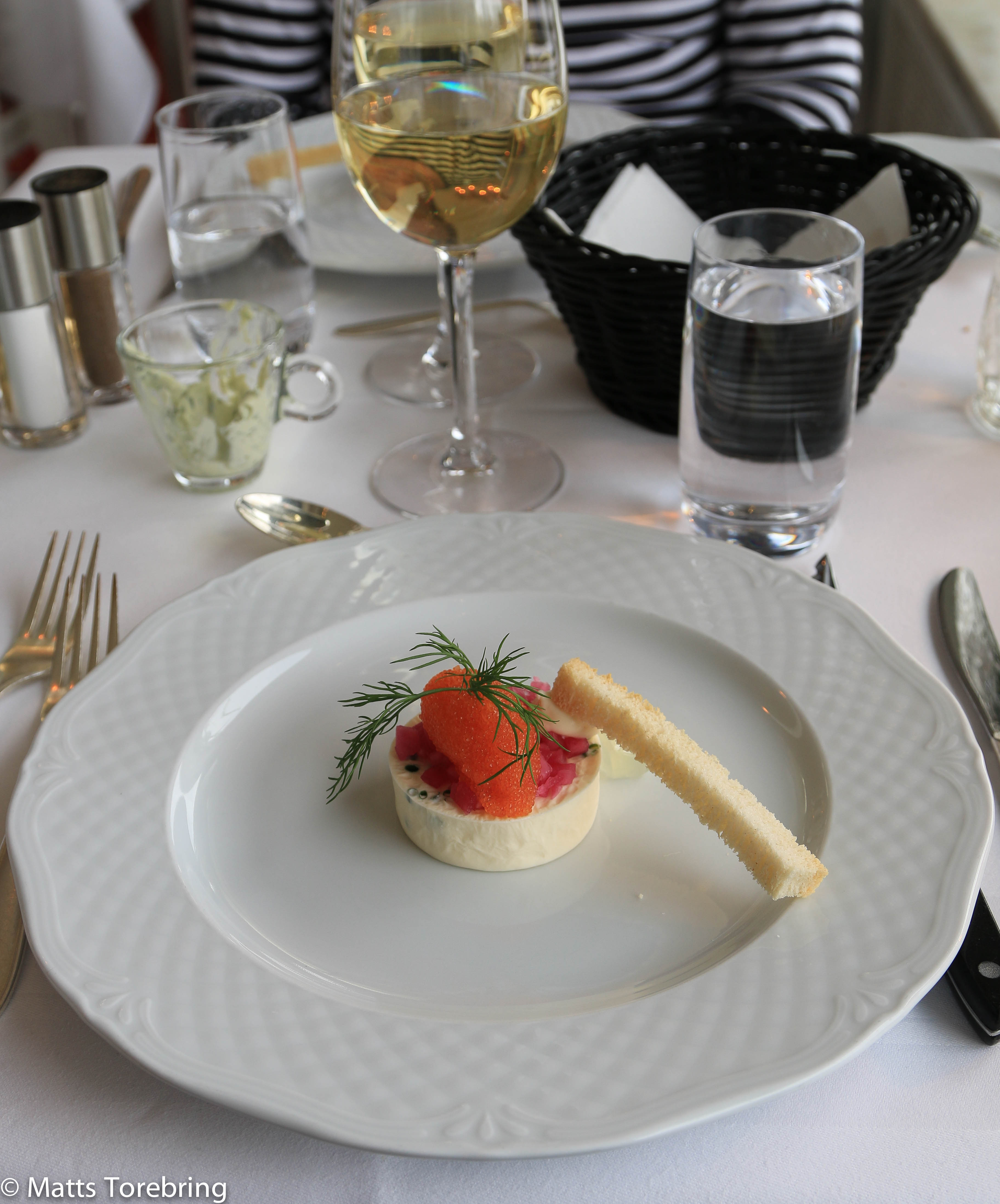 Löjromstoast med gräddfil-och gräslökspannacotta, rökt créme fraiche och citrongelé. Supergott!