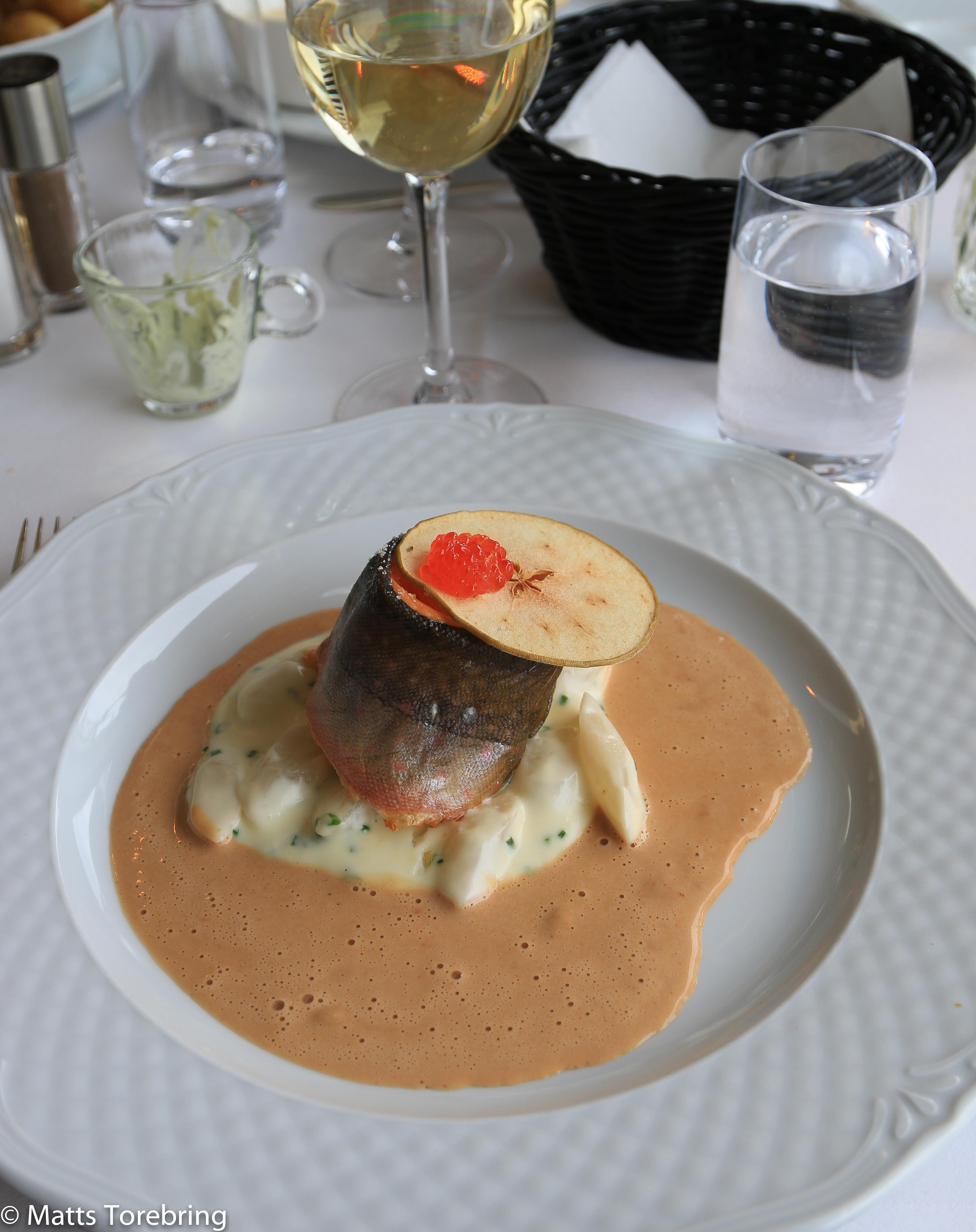 Röding med hummersås, stuvade svartrötter och smörslungad potatis. Oj vad mycket god fisk vi fick.