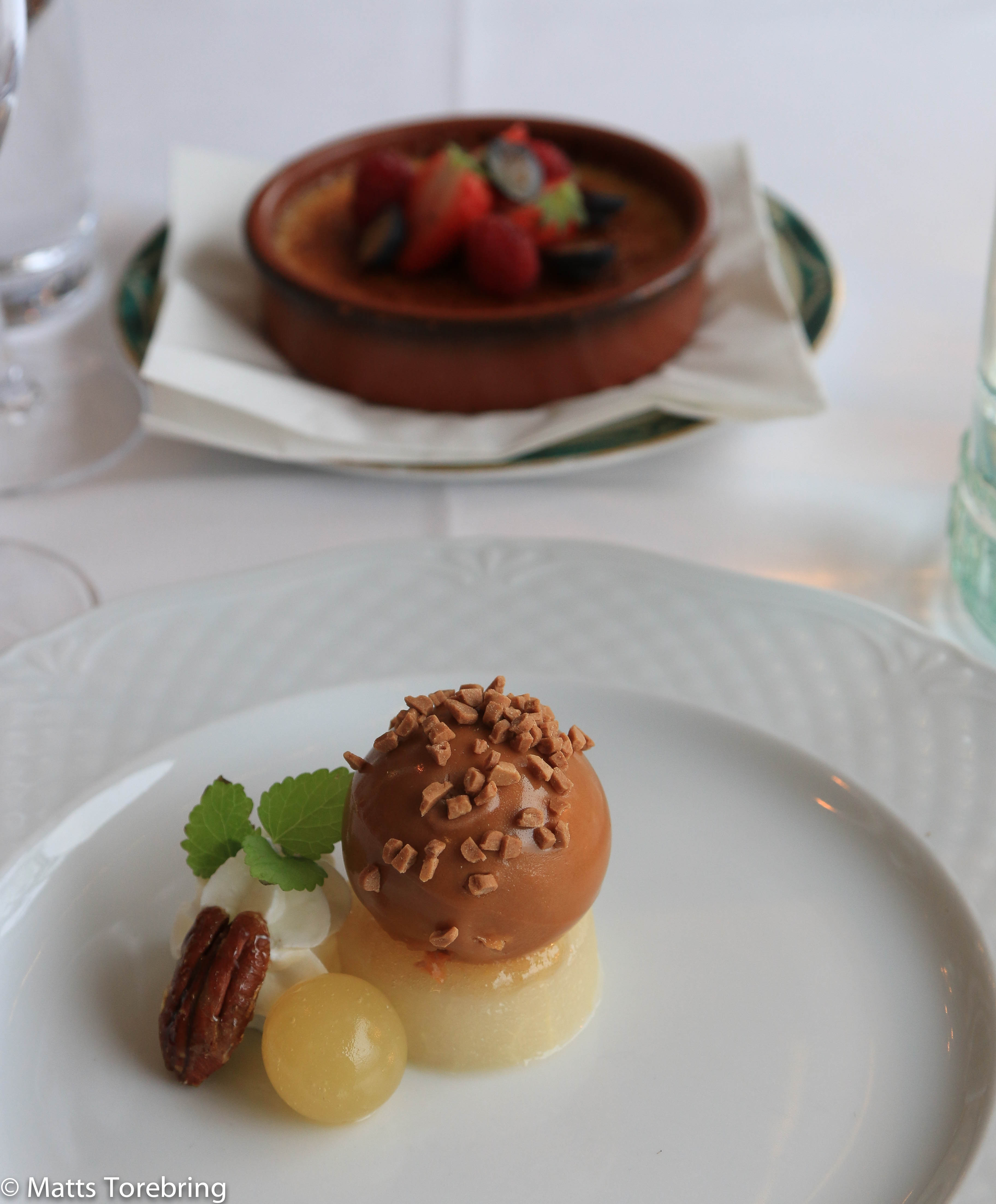 Jag åt karamellmoussekula med inkokt päron, turkisk yoghurt och kanderad pekannöt. Gissa om den var god. Birgitta åt Créme Brülée.