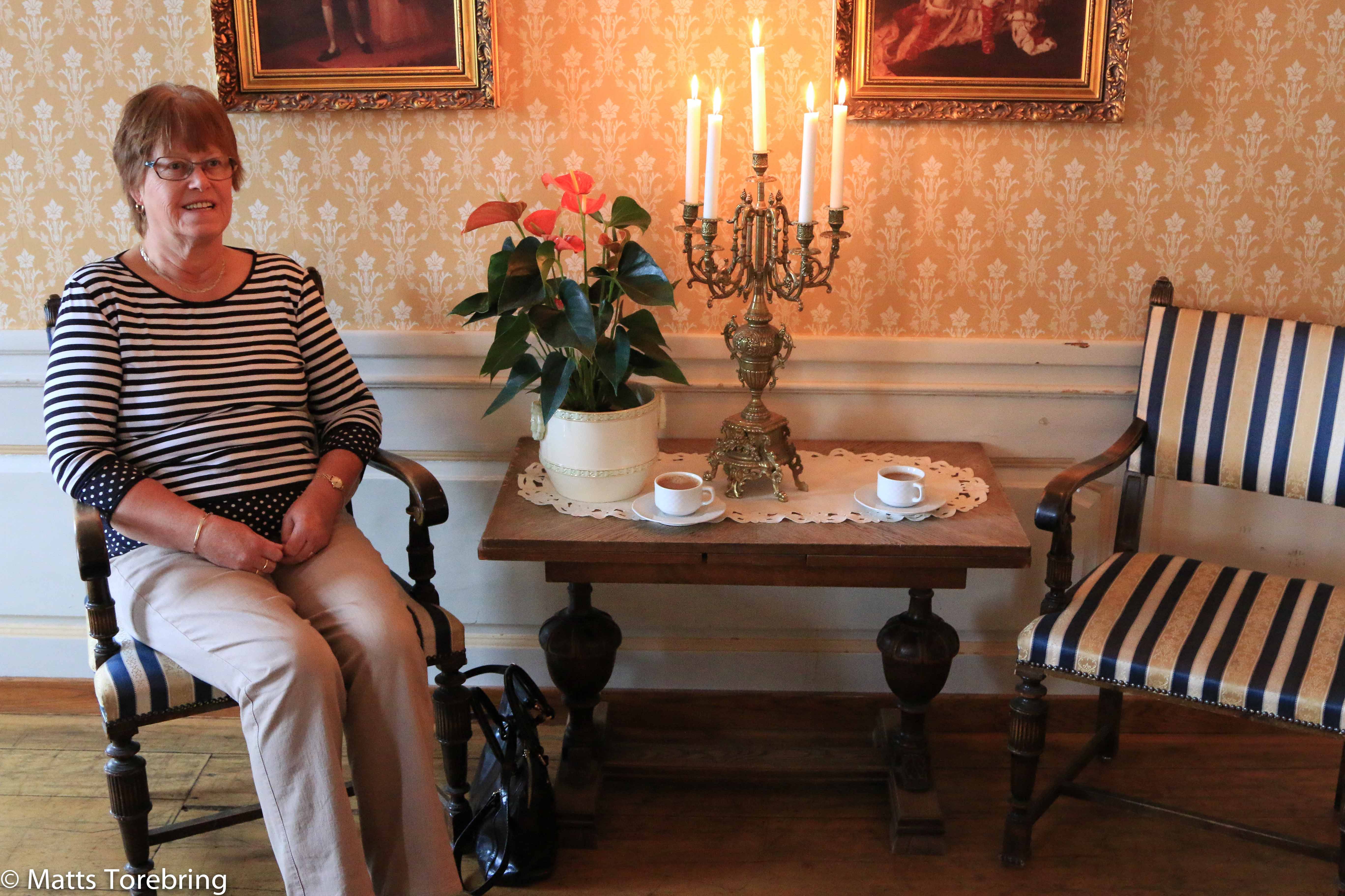 Kaffe på maten i ”Kungasalen”. Väggarna är prydda av kungligheter.