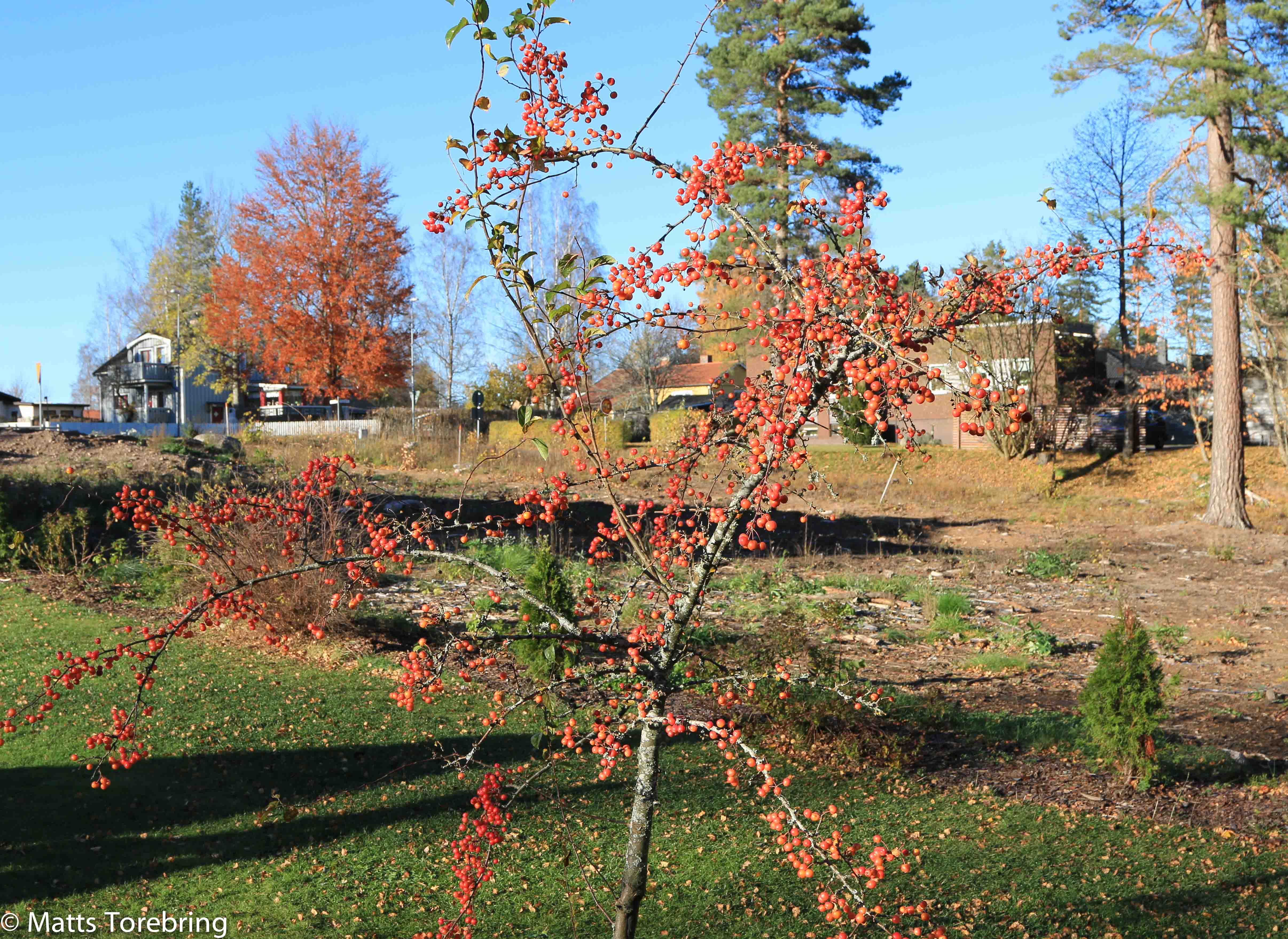 Det var så vackert när knopparna var på väg att brista ut, när det sedan blommade och nu frukten, som vi inte hunnit ta hand om. Om några dagar är det Allhelgonahelg. Träden brukar vara helt kala. Så är det inte i år! Trots den intensiva blåsten, under sista veckoslutet, hänger mycket löv kvar på träden.