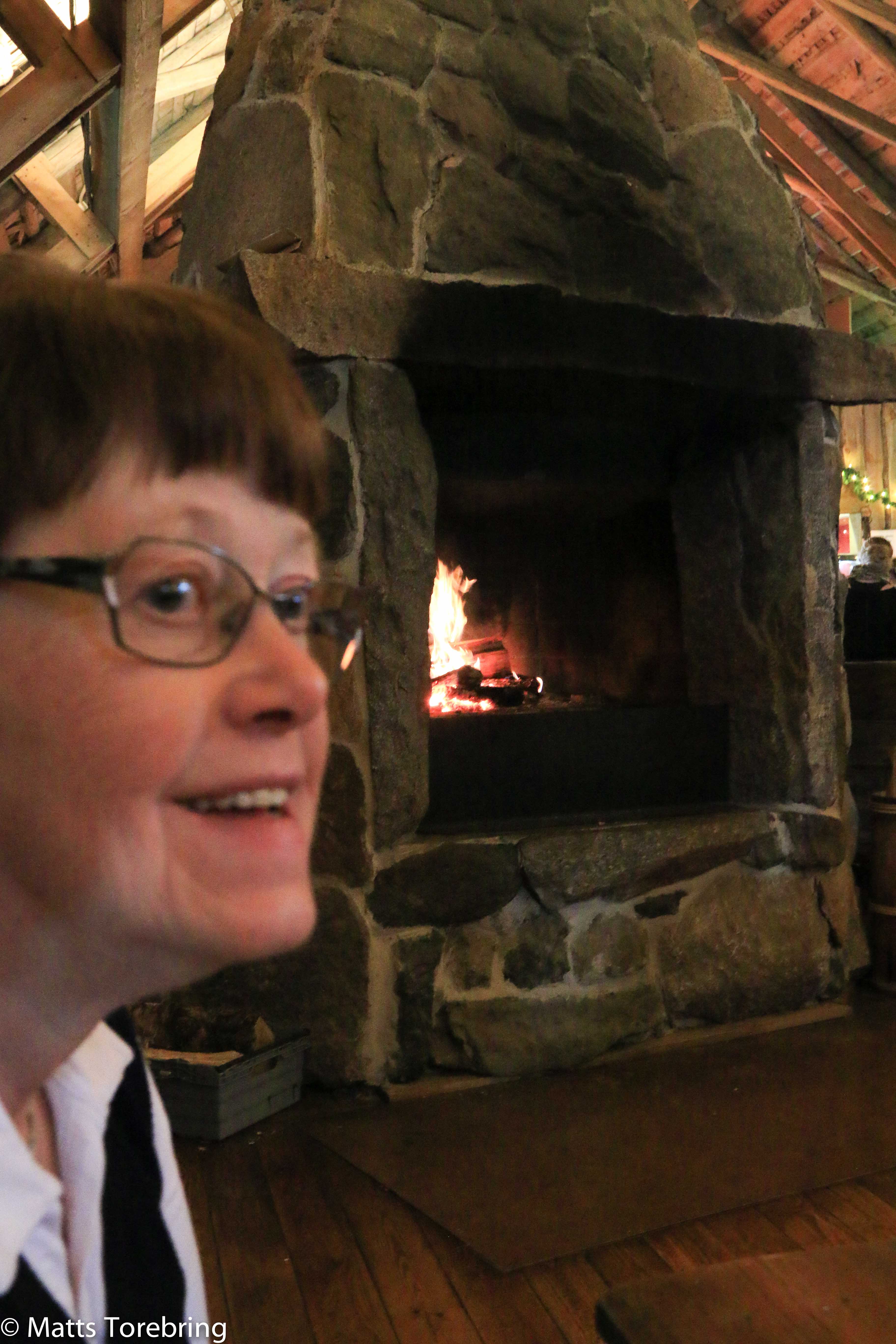 Minst en tredjedel av logen är  café. Där finns också denna väldiga öppna spis.