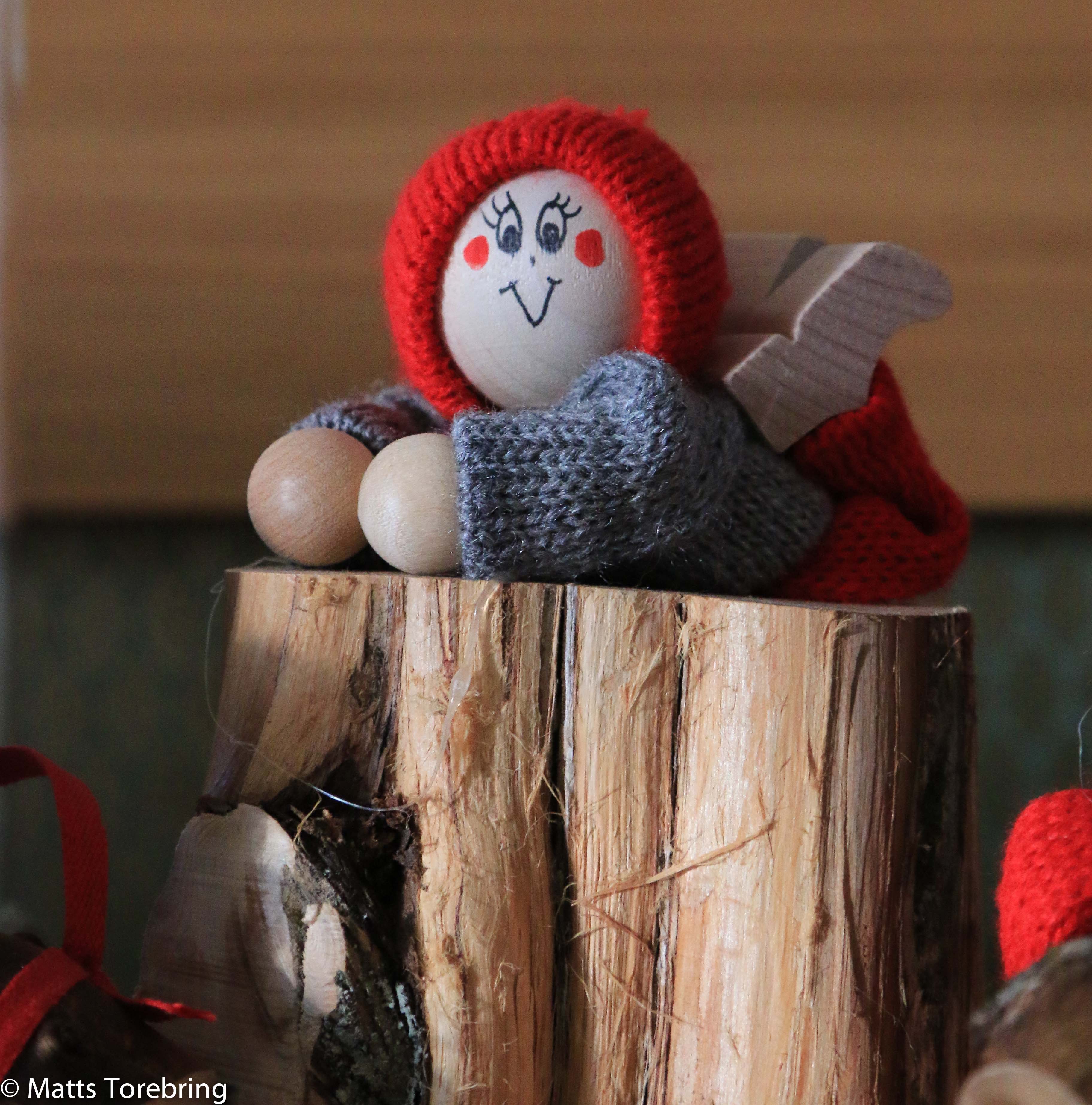 En trevlig dam stod förra året och sålde tomtar. Vi köpte flera stycken av henne då. Hon stod där i år också. En ensam tomte på en gren eller stubbe, endast 50:- och 100:- när det sitter två tomtar på en gren. Det tycker jag är för billigt! Vi inhandlade åtta styck tomtar!