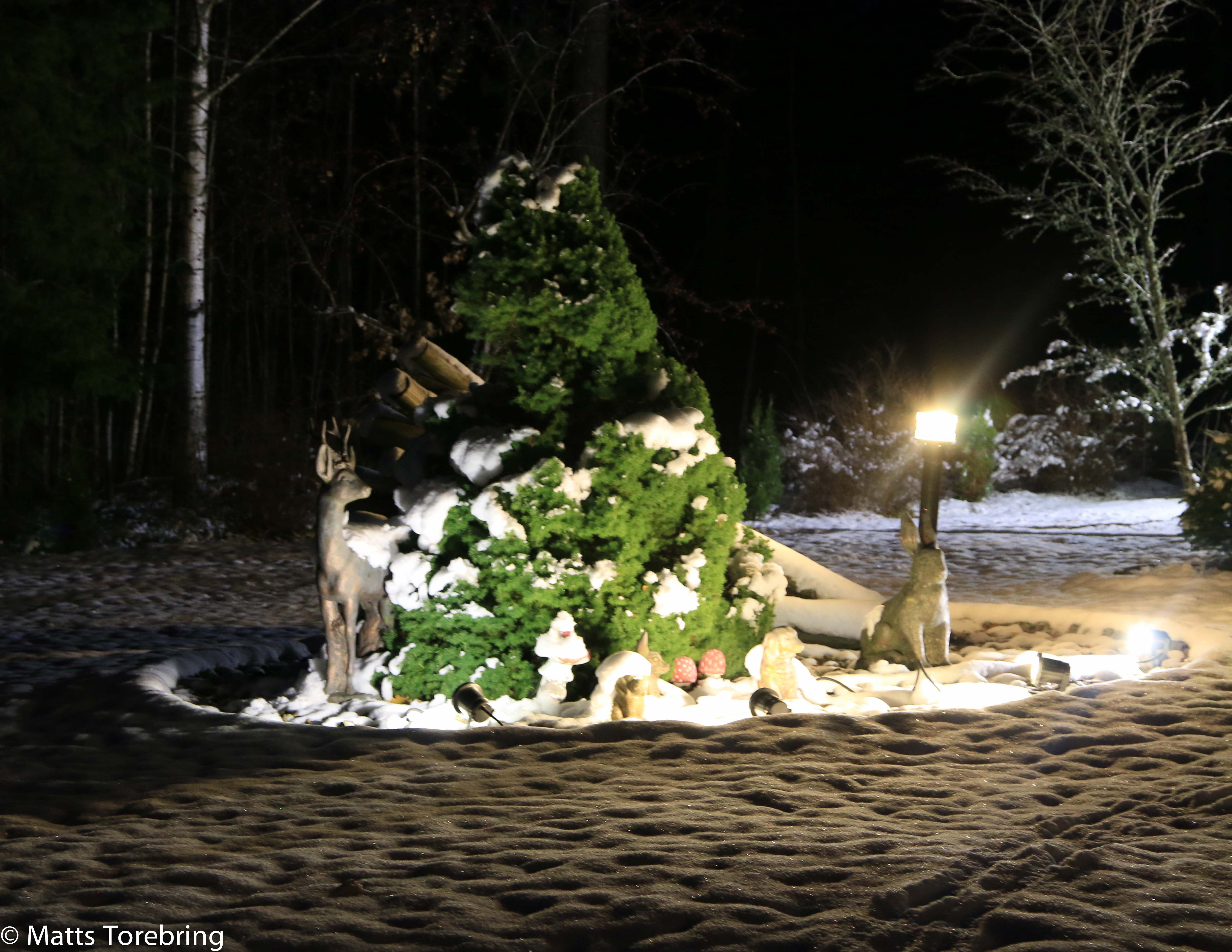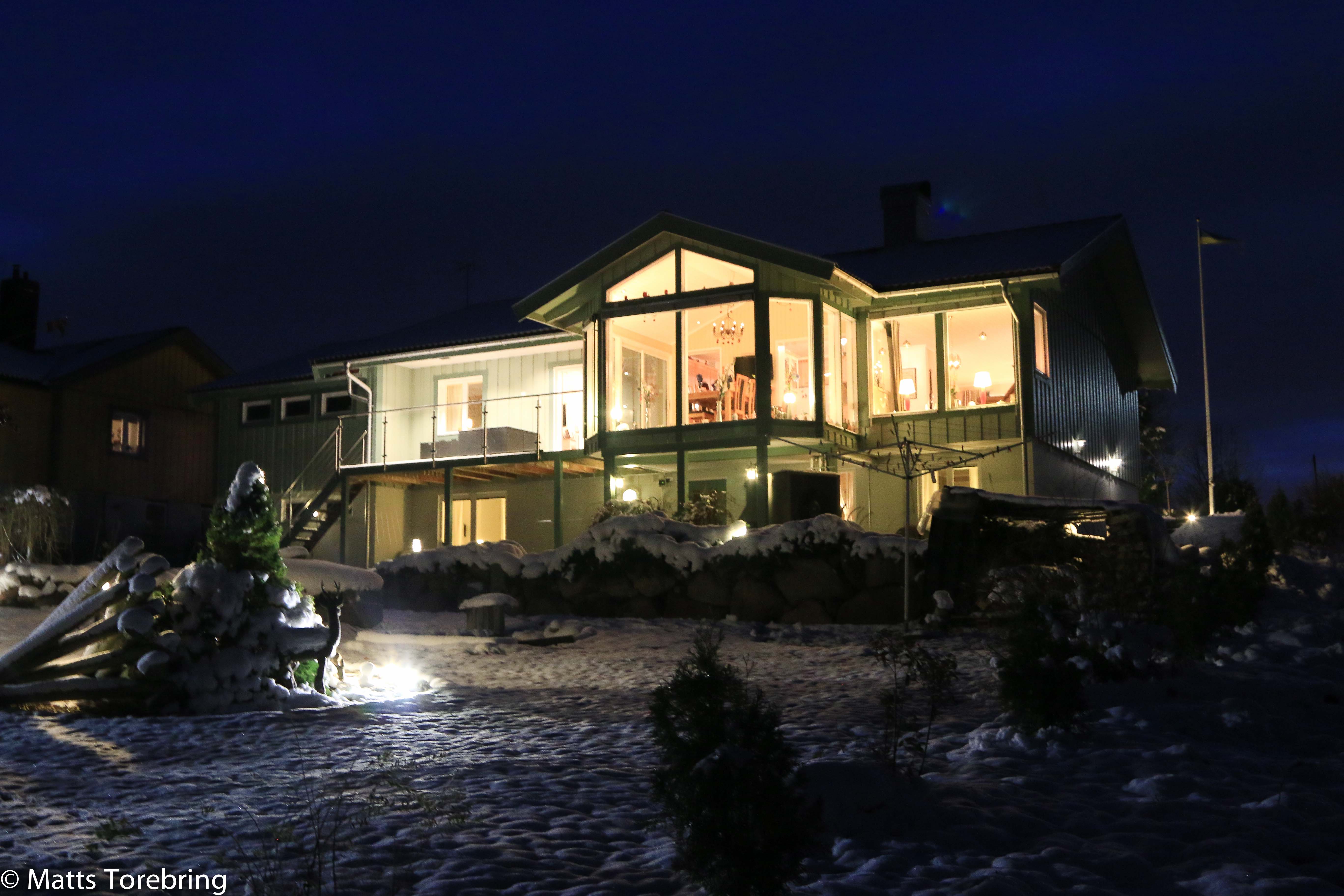 Vi gillar inte mörkret och vi gör allt för att skingra det, med så mycket belysning som möjligt. Här bor vi med nio rum och kök, samt två rum och kök i husbilen ute på gården.