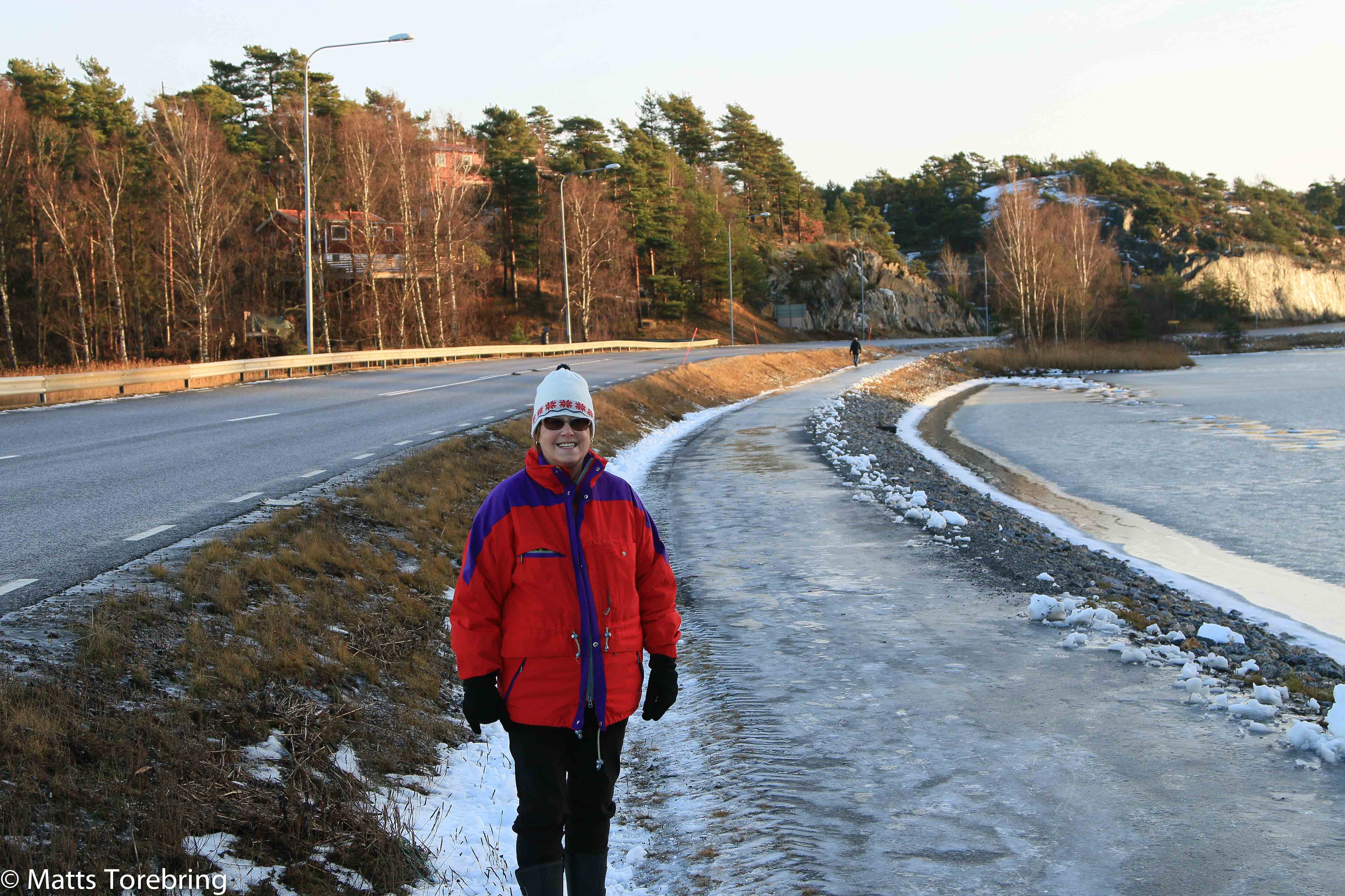Vi dividerade i timmar! Ska vi ta husbilen intill stan? Nej, då kommer jag inte in, till min plats igen på grund av isgatan. Lördag, söndag går ingen buss. Ska vi åka Taxi? Nej det är ingen sport! Ska vi gå? Ska jag gå ensam? Kan du följa med en bit på vägen? sa jag till Birgitta. Sagt och gjort, Birgitta följer med en bit….(Hon gillar inte att promenera) Vi går sakta och parerar för de värsta isfläckarna.