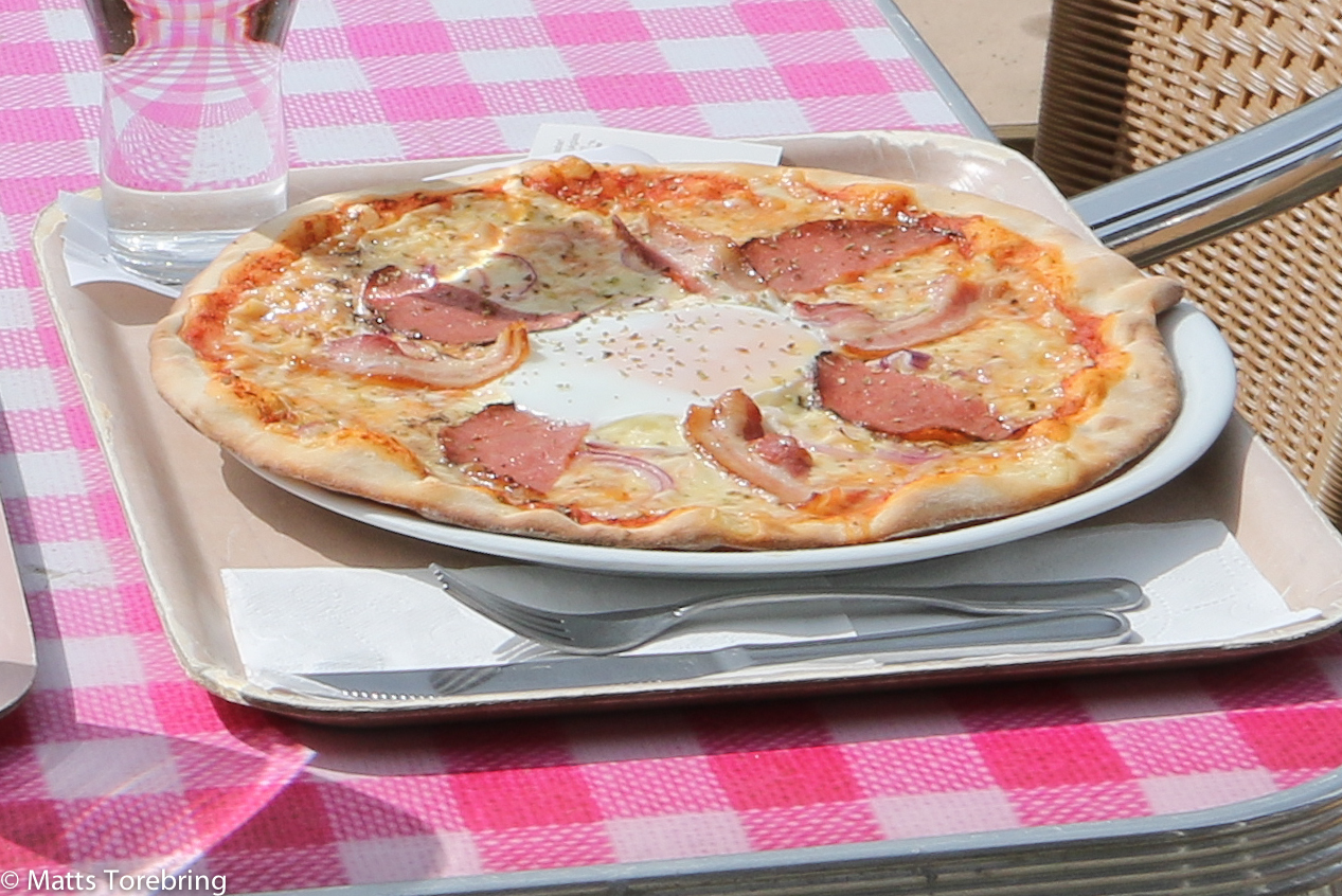 Vädret växlar verkligen. I mitten på pizzan ligger ett stekt ägg. Den var ovanligt god med en fantastiskt bra smak