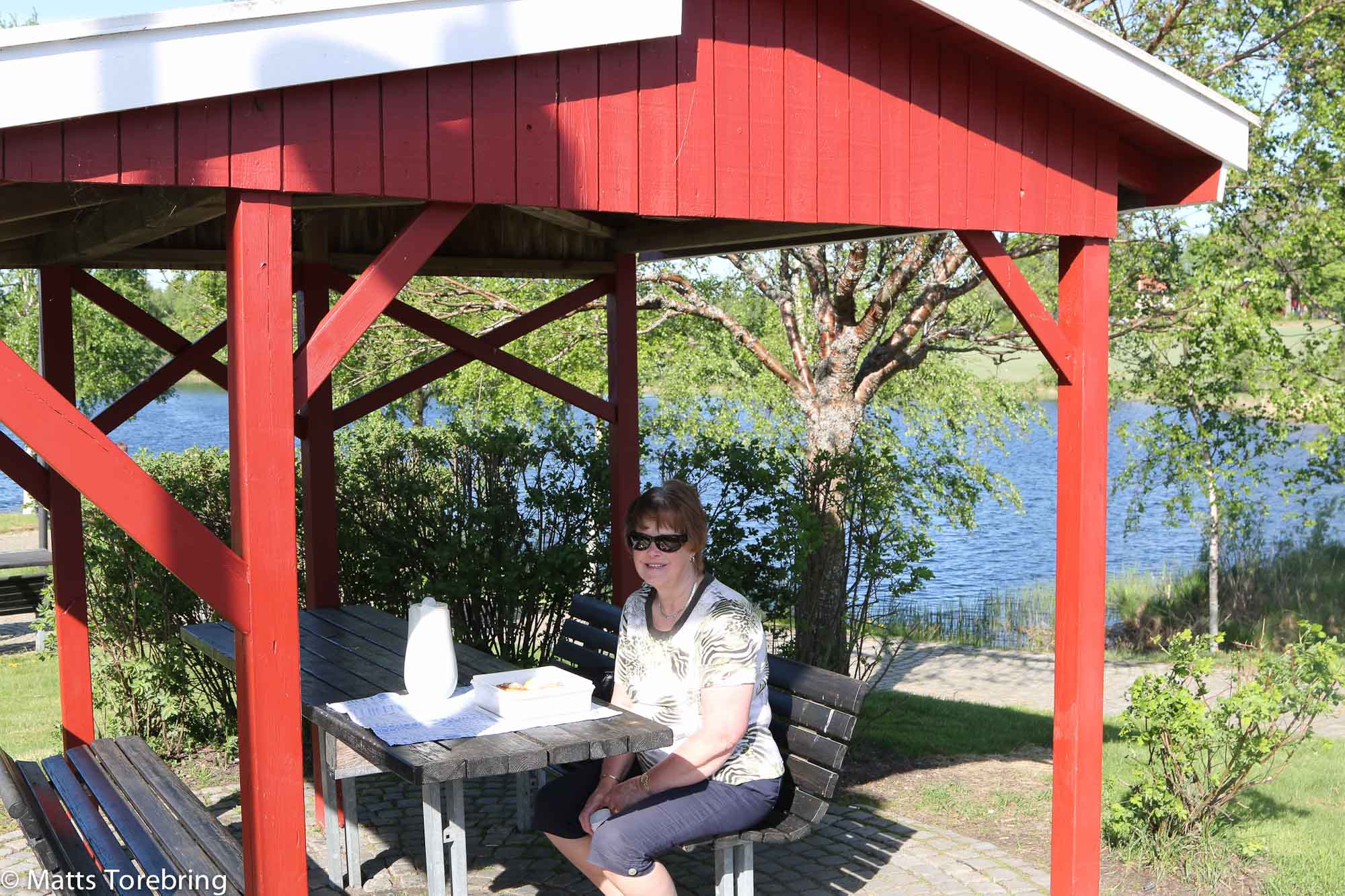 Morgonkaffe i solskenet på Risbro rastplats.