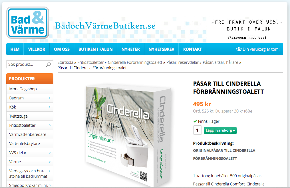 Vi frågade hos ”Husbils-Svensson” i Lidköping efter påsar till vår nya Cinderella förbränningstoalett samt briketter till Cobb grillen. Jag fick det roliga svaret: ”Fråga dem som säljer sådant”! Kabe hade inte heller ”hunnit få hem” påsar ännu. Cobb grillbriketter hade de hemma och bra stolar. På mindre än två minuter via Prisjakt, beställde jag tre förpackningar med påsar, hemma på altan. Vi som sprungit i timmar och letat.